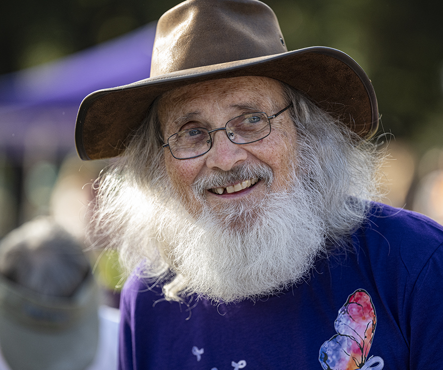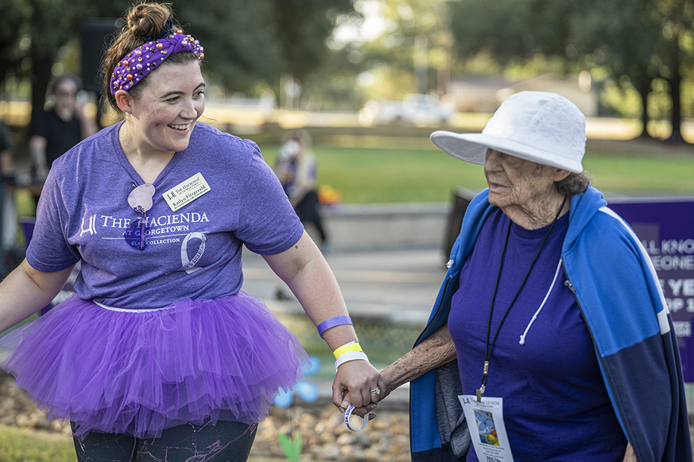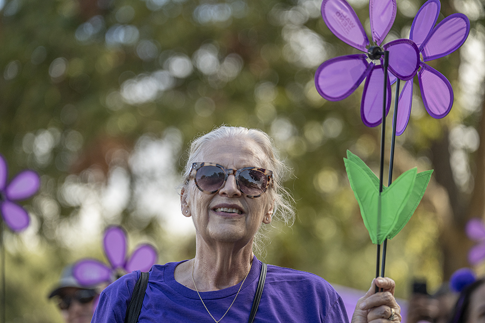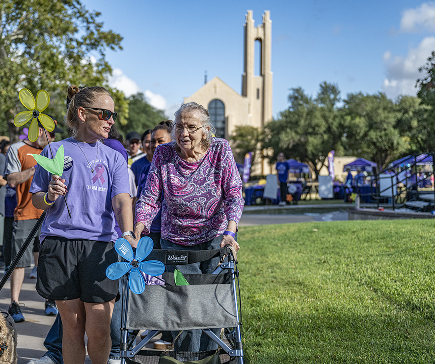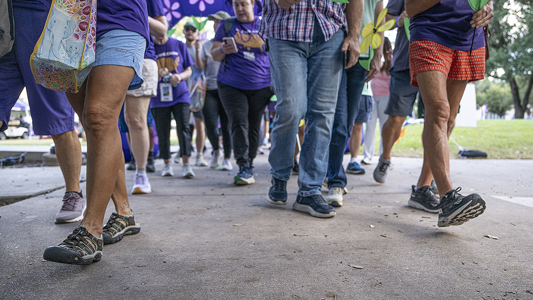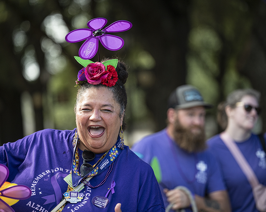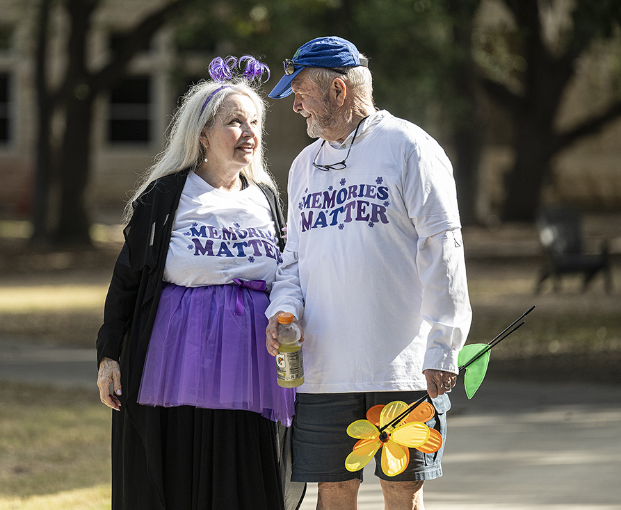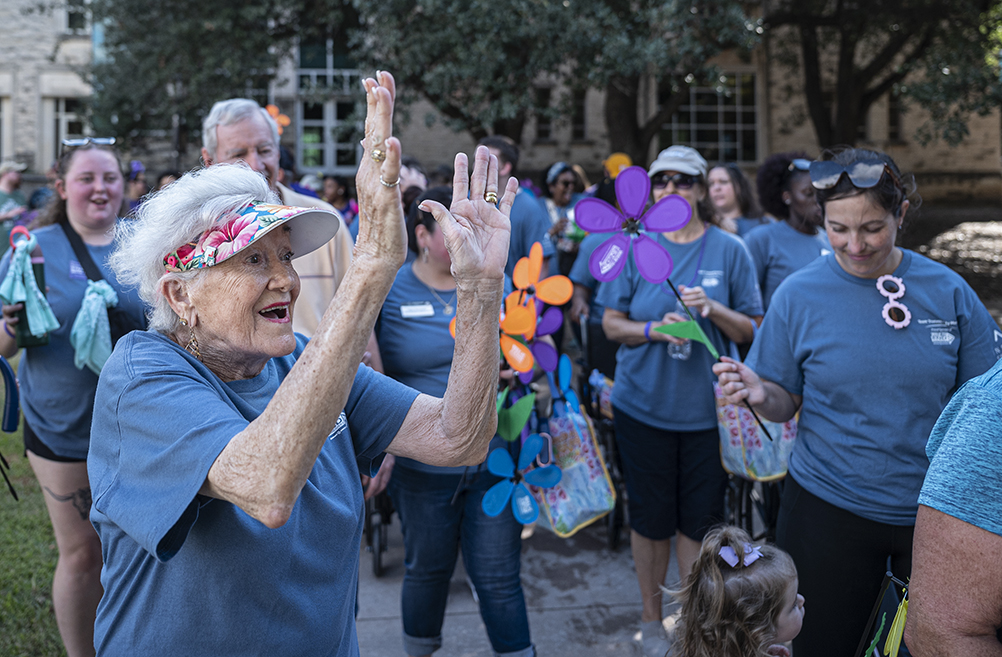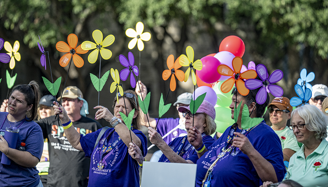 About 600 people took part in the Walk to End Alzheimer’s this morning at Southwestern University in Georgetown. Most photographs are self-explanatory, except for the colorful flowers. Purple indicates participants have lost someone, blue means you are living with the disease, yellow denotes someone who supports or cares for someone with Alzheimer’s and orange indicates you support the cause. The goal is for a white flower, which means a cure has been found.
