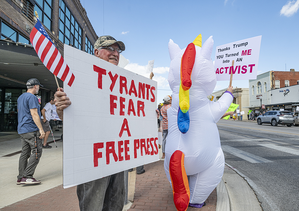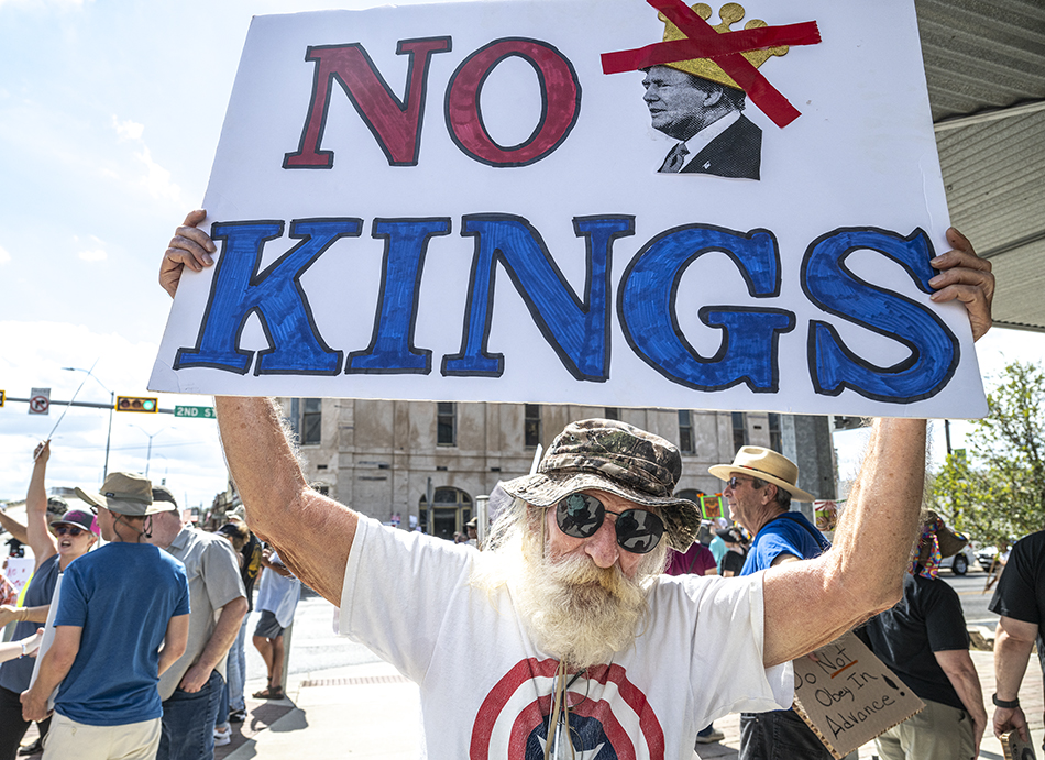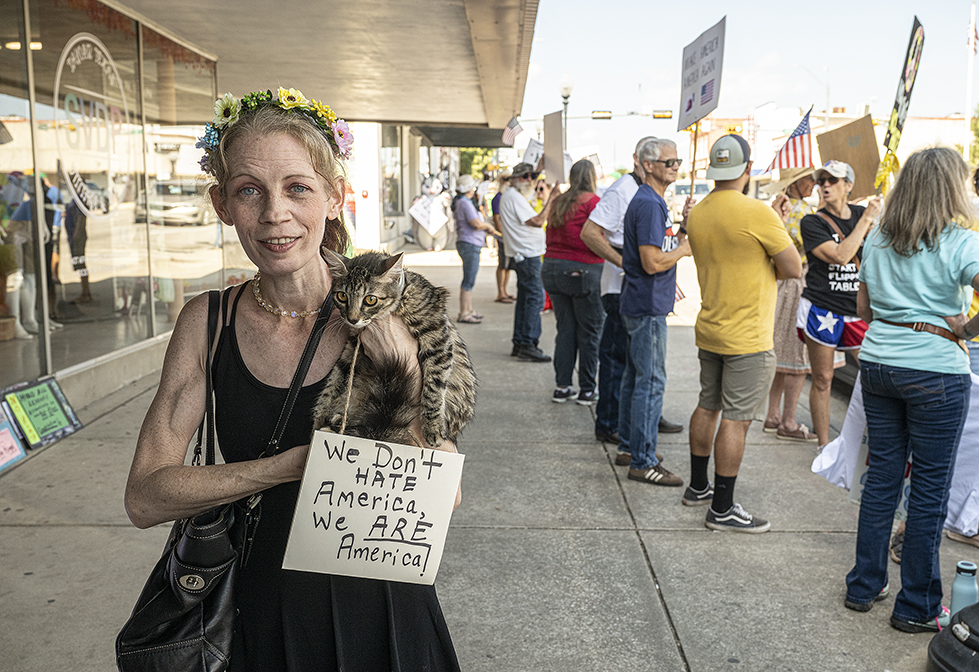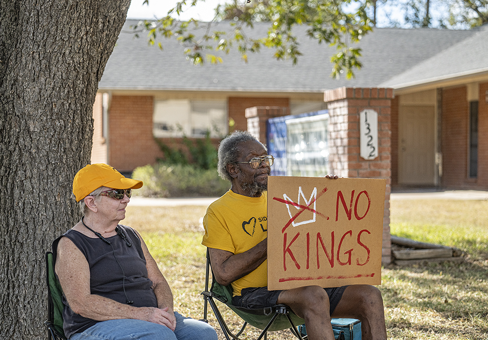 Coverage of “No Kings” demonstrations today in Williamson County, Texas. Wasn’t sure there would be a post here, but the opening photograph, in Taylor, prompted this one. His sign spoke volumes. In case you don’t recall, or know, this five decade career is photojournalism. Perhaps more on that later. Most of these were in downtown Taylor, where about 300 people showed up. A kitten named Gigi was present with her human. A couple, presenting an opposing view, was heckled quite a lot, but they have every right to be there. The last one was in Georgetown, where a couple conducted their own quiet vigil in front of the San Gabriel Unitarian Universalist Fellowship.