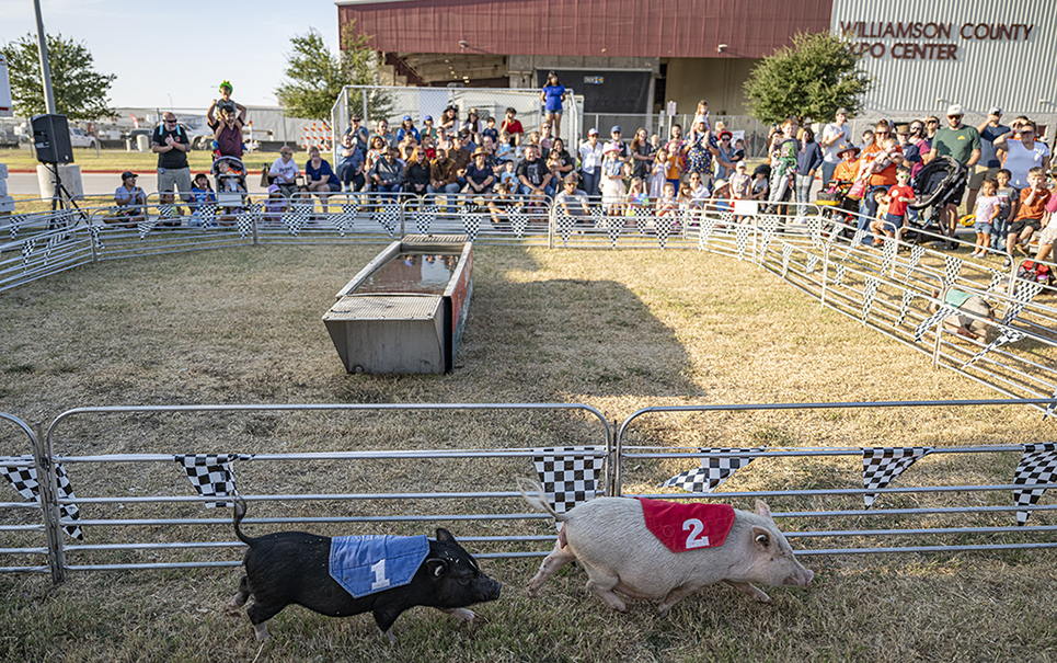 A few scenes from the first night at the Williamson County Fair, continuing through Saturday at the Williamson County Expo Center in Taylor. Pig racing, courtesy of the Swifty Swine Show pigs, plus a chance to get close to Honey Boo Boo, a 7-month-old piglet. Stick horse races were a fun outlet for the kids. And the midway is beautiful. The fair’s rodeo begins its three-night run this evening.
