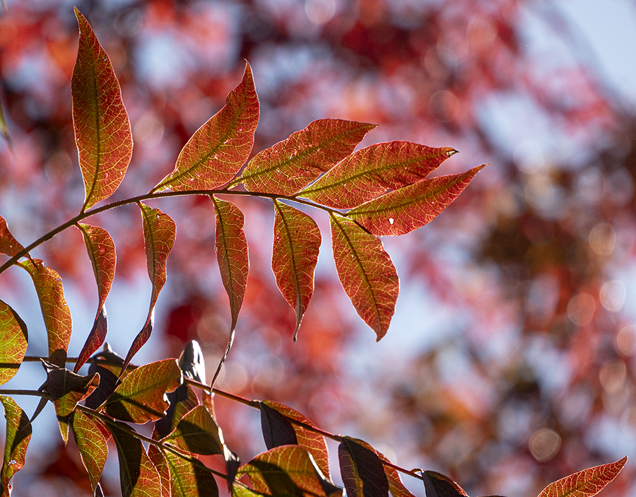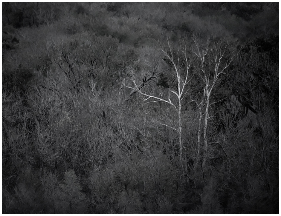 This stand of trees becomes more interesting as autumn progresses each year. Sometimes there’s enough color to merit a post. This cloudy evening, however, those old trees really stood out when offered in black-and-white. Just a simple monotone, friends.