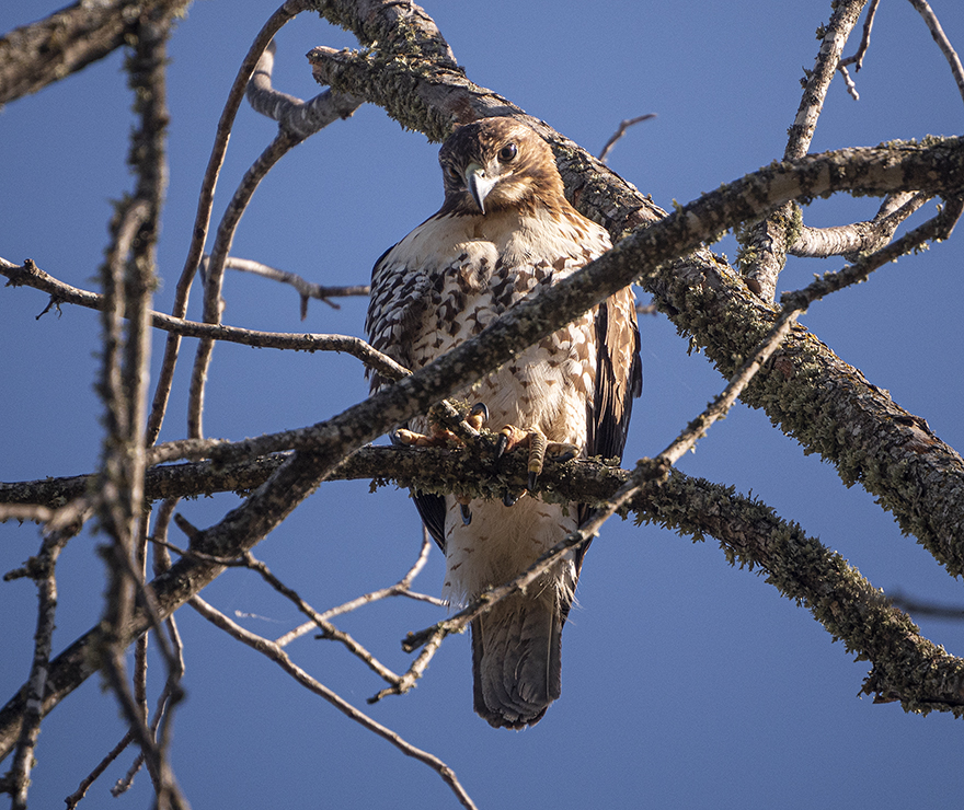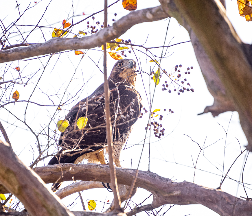 Raptors of any kind are usually seen on utility poles, or very far away, near trees. This week, however, a focused hawk nestled in a tree for a quite a while. On the ground below was the the body of a squirrel, likely why she waited for the camera to go away. Two photos of the raptor are posted. The rest are just bits of this and that. One wider photo shows a scene along Bull Branch Creek, where one of several trees have been recently removed. Hopefully, there was a good reason for this. Trees are important. Everything needs to be done to save them. The post ends with a nice little squirrel making eye contact.
