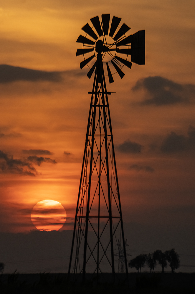 Windmills are photographed a lot, but not always offered here. The sunset seen tonight, however, passed muster.