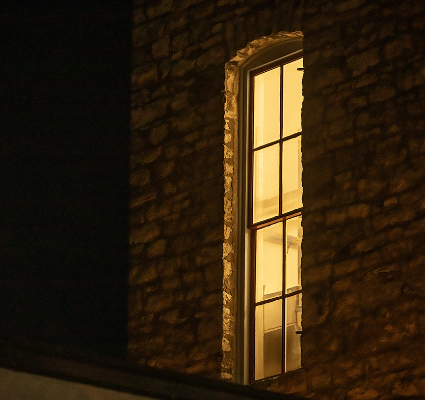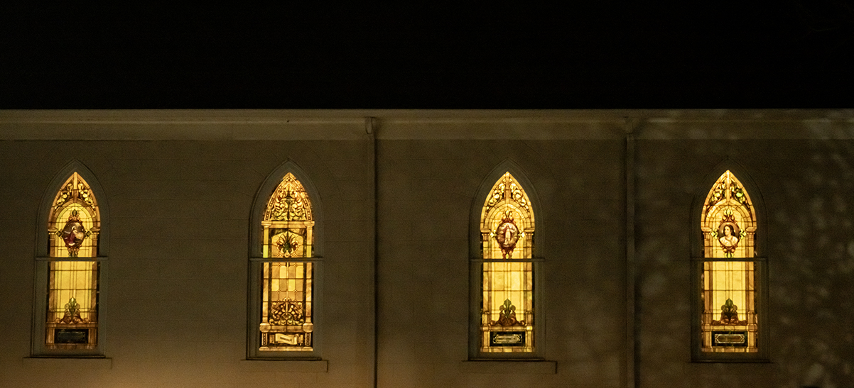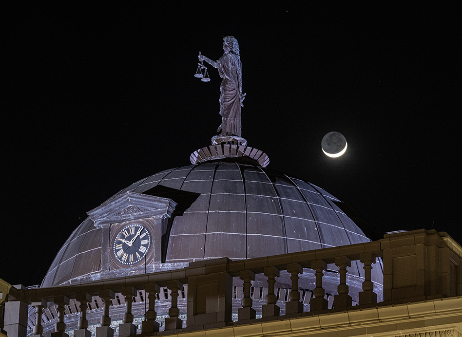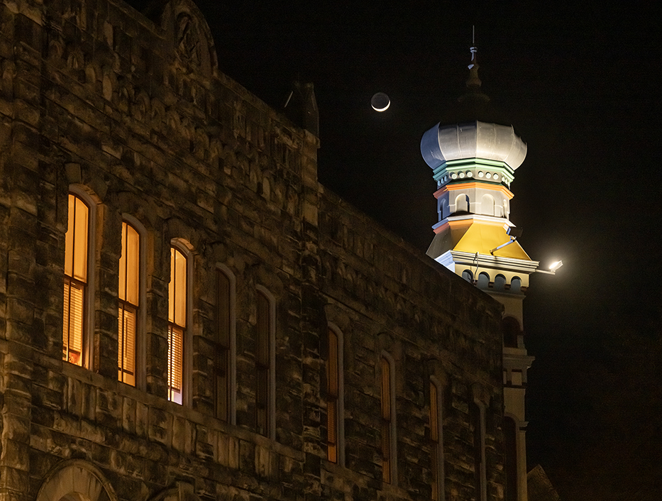 From around the Georgetown square tonight. A Waxing Crescent moon, at 10.7% visibility, hovers above in two photographs. Just light in the last two, including the stained glass windows of First Presbyterian Church.