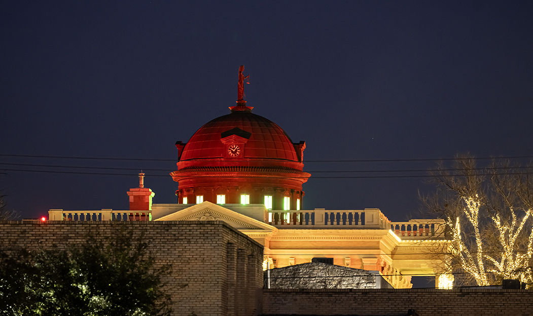 Three photographs from tonight. A couple walks across the dam spanning the San Gabriel River at San Gabriel Park, the Williamson County Courthouse on the Georgetown square continues to shine. And a Waning Gibbous moon over the San Gabriel River, as seen tonight in Taylor.