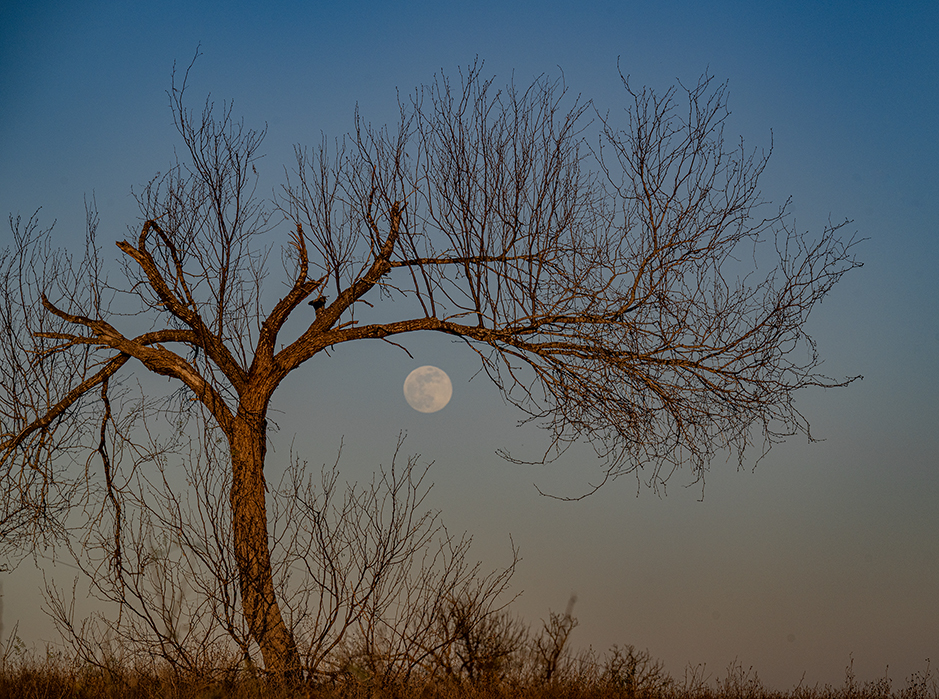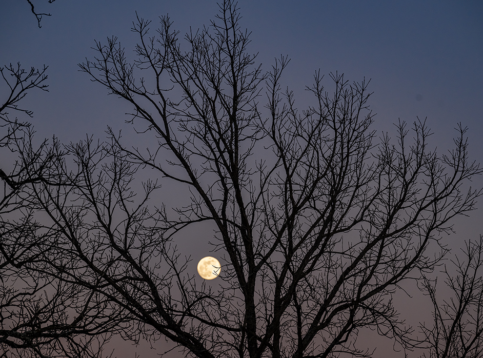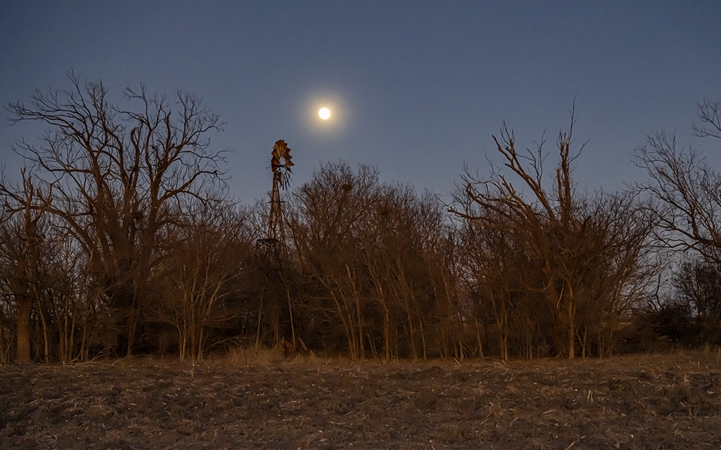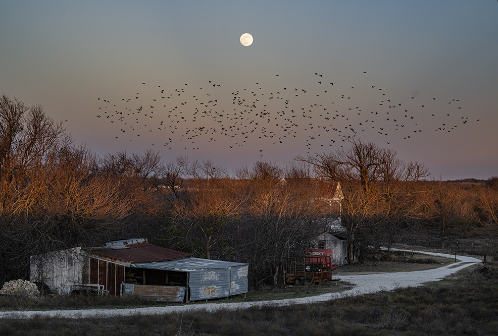 We were glad to see the first full moon of the year tonight in our area. These photographs begin at a friend’s ranch in Circleville, where the starlings were quite active, then going north a few miles to Granger, where holiday lights still shine.