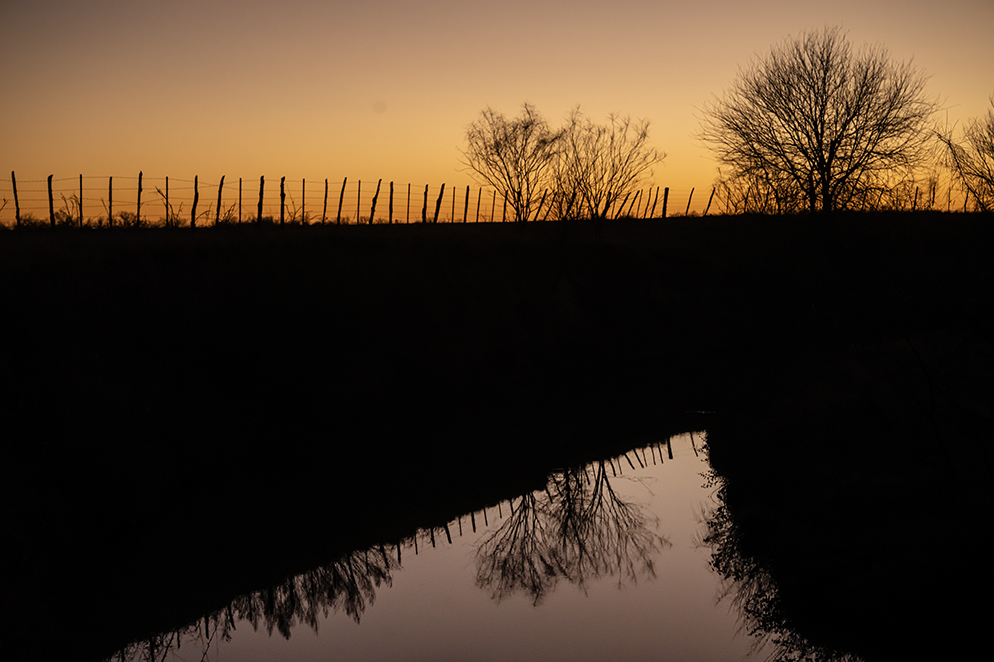 From an outing this evening near Granger, Texas. The fence posts were the original thought, but the stream below pulled this together. Time of day is important. In the middle of the day this is a pretty mundane scene, but it improves near day’s end. Time of day matters.