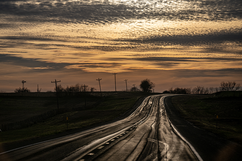From a quiet Sunday drive through Falls County, Texas. Assisted by sun and clouds, the winding road was shimmering. It helped to have a windmill present, too. A simple and peaceful outing.