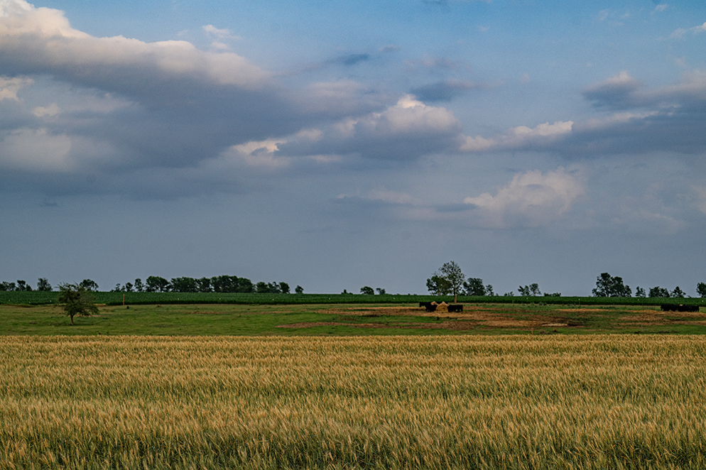 Late-day light falls on a thriving wheat field east of Granger. Things just look better with the right light. In the distance are cattle, followed by cornfields. There’s much to see here.