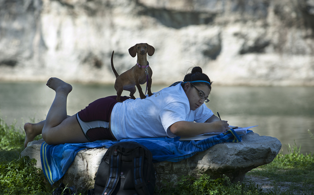 Spring is almost here in central Texas, but university exams have already arrived.   At least there’s nice places to study, like Blue Hole lagoon, on the South Fork of the San Gabriel River in Georgetown.   That’s where I found Southwestern University senior Biology major Alyssa Granado hard at work Monday afternoon, accompanied by Bonnie, her 7-month-old rescue weiner dog.   Alyssa was hard at work studying for a microbiology exam this week.  Hopefully, she did just fine.   Bonnie, of course, provided encouragement.