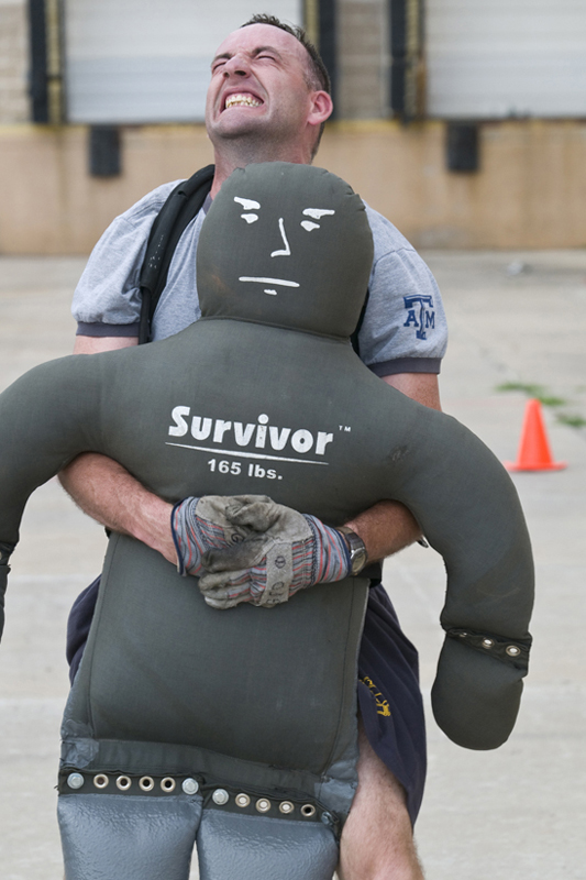 GEORGETOWN, TEXAS: Jonathan Andes, 32, from Round Rock, gives a determined effort to drag a 165-pound dummy 50 feet to simulate rescuing an unconscious person in this photo taken Saturday 5/22/2010. He was one of 88 hopefuls who showed up this weekend to take a timed agility exam with the hopes of landing a spot later this summer with the city of Georgetown Fire Department. Of the 88 potential recruits, only 11 will be hired, probably in July. In the fire department’s agility exam, recruits (who have all already been to fire academies in various areas) must do seven stations in nine minutes or less. They begin the process with having to climb 75 feet up a ladder truck. The ladder climb, however, is not part of the seven timed stations, but all going through the stations must do the climb first to prove they don’t have issues with heights. The agility exams were held all day Saturday and Sunday in the old Albertson’s store parking lot just off Austin Avenue and near Williams Drive. Photo by Andy Sharp.