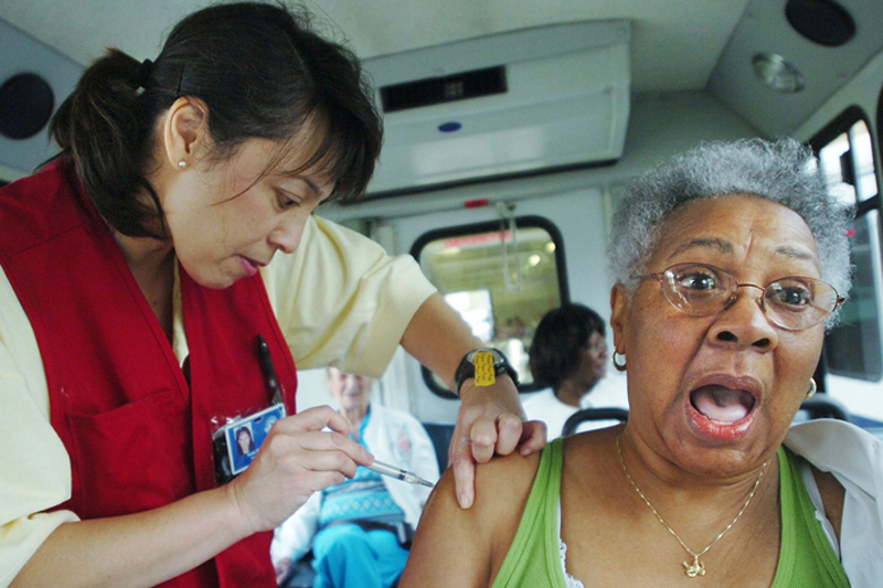 MARIETTA, GA (cobb): Earnestine Quick, right, of Kennesaw, reacts as she gets a flu shot from nurse Rose Bishop in this 2007 photo taken Jim R. Miller Park during a mass flu clinic being overseen by the Cobb & Douglas Public Health Department. Quick said she doesn’t like shots, but handled this one pretty well. Quick came to the park today on one of a number of Cobb Senior Services vans for her shot. Photo by Andy Sharp