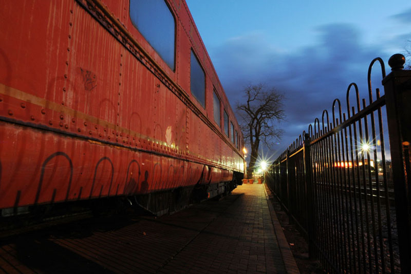 MARIETTA, GA … On a cold February evening in 2009 an old red caboose shines near the Marietta Square. The vintage rail car has rested near the railroad tracks for many years. The exposure for the photo was ten seconds with a flash fired several times during the image capture. Photo by Andy Sharp.