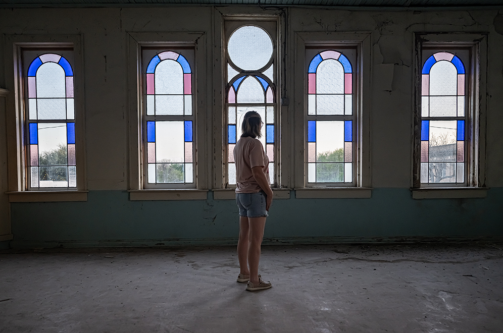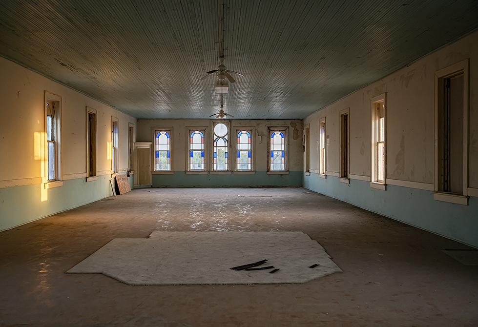 The exterior of the 1909 Granger SPJST Hall has been a photographic subject for years. The 117-year-old structure rests along West Davilla Street in downtown Granger. As always, a snippet of what “SPJST” means. Founded in 1897 by members of the Czech community, it stands for Slovanska Podporujici Jednota Statu. In English, it’s the Slavonic Benevolent Order of the State of Texas. it’s a Texas-based non-profit fraternal group that promotes Czech heritage and organizes community, social and youth activities. Through the years they”ve also assisted with insurance for members. The exterior is the opening photo, but the rest were made in the atmospheric upstairs area. One photo looks out a window, showing the spire of Saints Cyril & Methodius Catholic Church in the distance. Last May, an SPJST officer suggested it needed to be seen. The building was going up for sale. We’ve been in touch since last year, but the interiors were taken Wednesday night. A lot of folks raised in Granger have fond memories of attending their high school proms up there. One can imagine how nice that was. As this is written, it might still be on the market, but there are strong indications a buyer is close. We’ll see. The only hope is that whoever owns it will continue to preserve this beautiful piece of Texas cultural history.