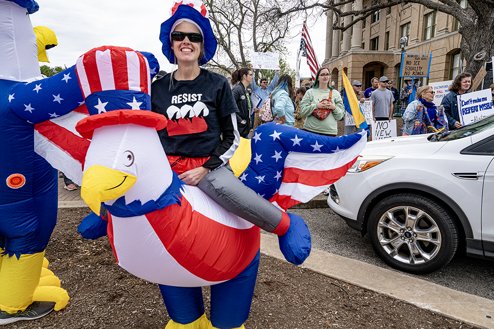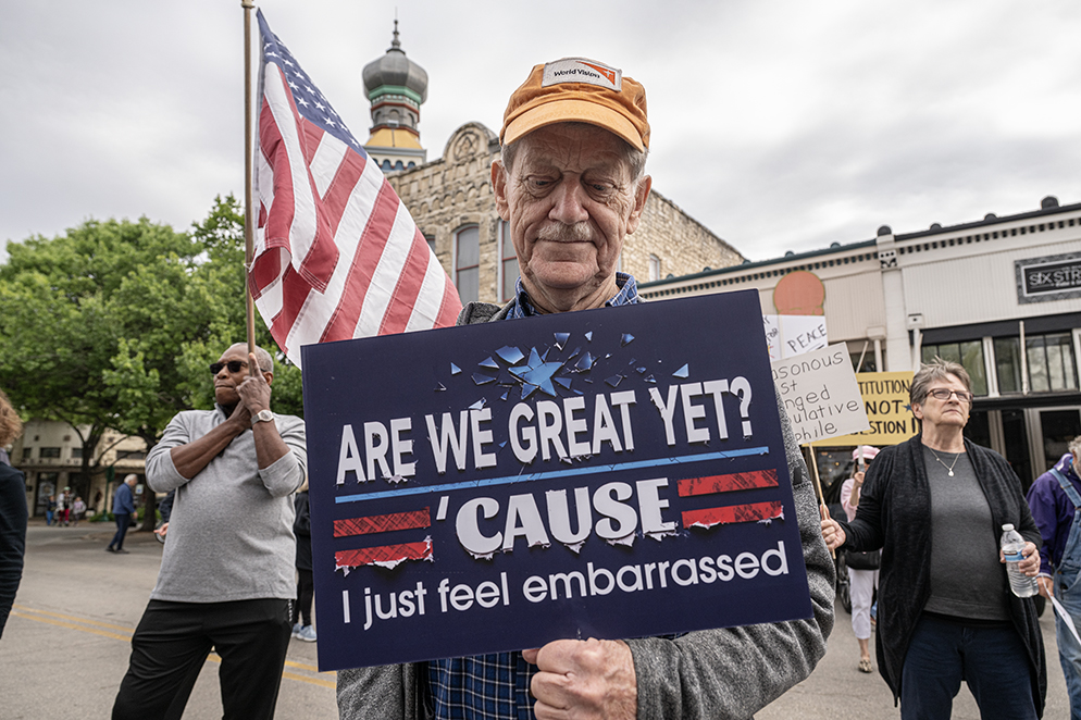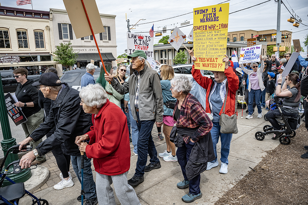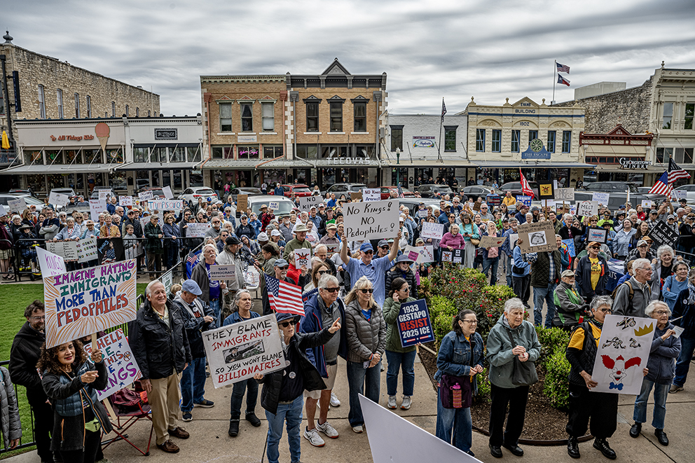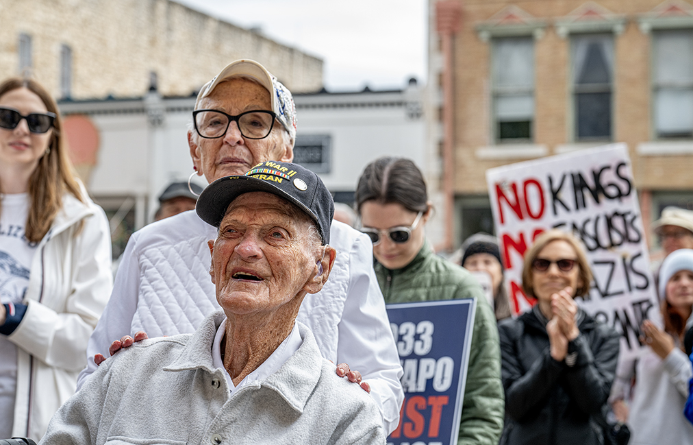 Photographs from today during Georgetown’s No Kings event held on the town square. The crowd was estimated at 700. Temperatures were nice, in the 50s and 60s throughout the event. The favorite photo is the opening one, a World War II Navy veteran who will be 100-years-old in June. Even though the career has been in photojournalism, most posts don’t offer up news events. These No Kings events, however, do garner attention.