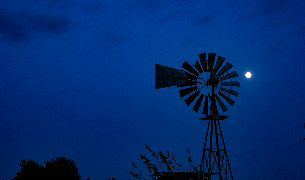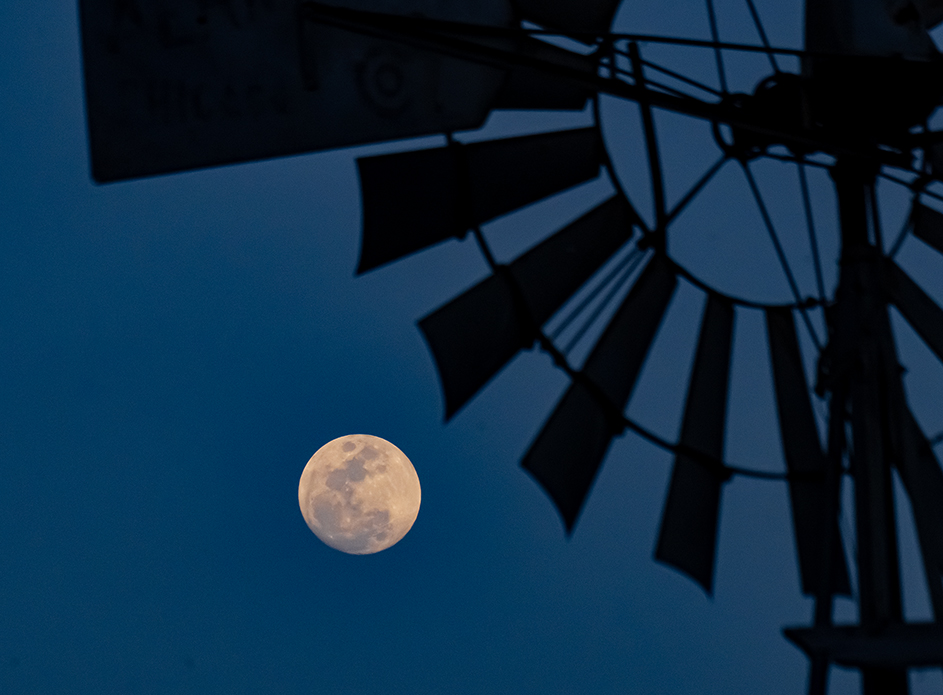 Our moon on this clear night was at 99.1% visibility, a Waxing Gibbous moon, almost full. The blue evening light was calming. Two different windmills, plus a little grove of trees. All are near Granger, Texas.