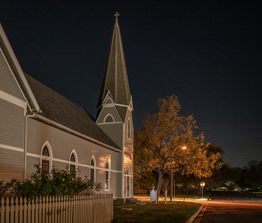 Taylor’s St. James Episcopal Church, built in 1893, is an elegant structure at the corner of 7th and Davis Streets. Recent new paint and other renovations make it really shine, especially at night. Included are three photographs taken this week. A tripod was used, allowing slower shutter speeds and a lower ISO.