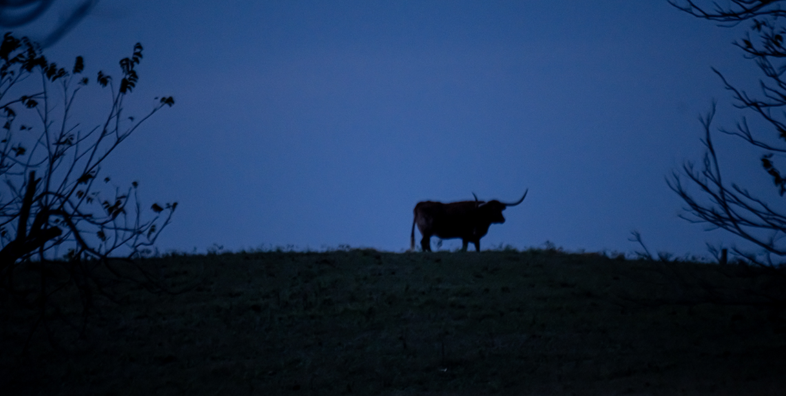 Another single photograph tonight, a fine Texas Longhorn relaxing on a hill at day’s end near Taylor, Texas.
