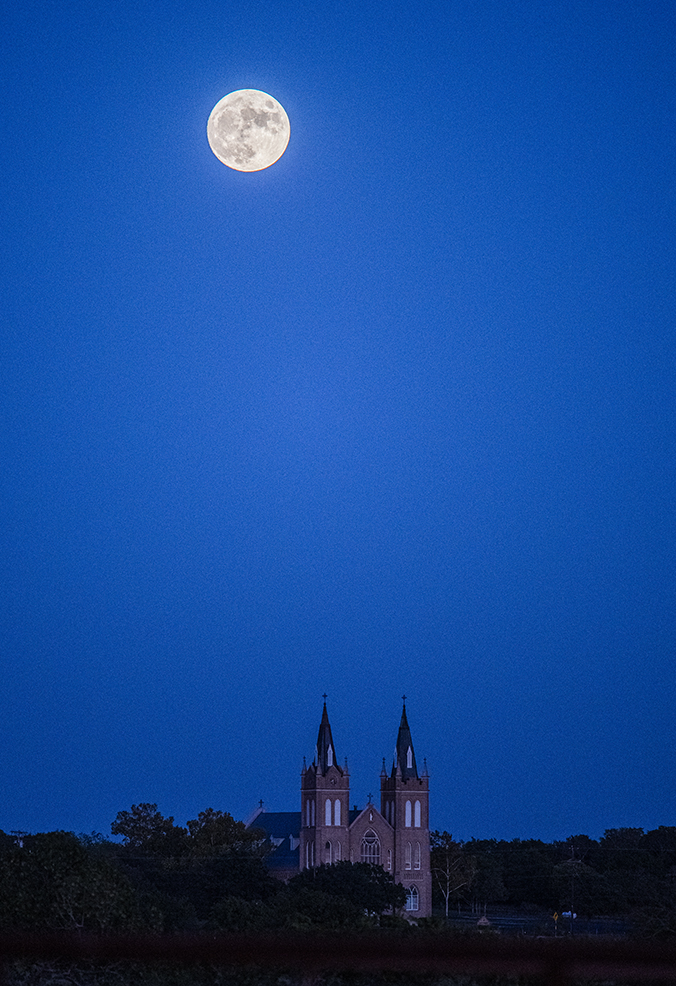 Tonight’s moonrise photos are in the northern part of Williamson County, Texas. It’s a Waxing Gibbous moon, almost full at 99.4% visibility. The opening photo shows a Texas Century Farm, a farm that has been in the same family for at least 100 years. This is a little north of Walburg. A bit further north is Holy Trinity Catholic Church of Corn Hill, its twin spires visible for a few miles.