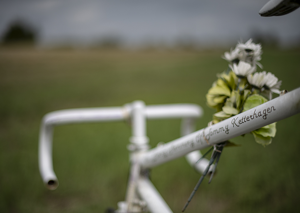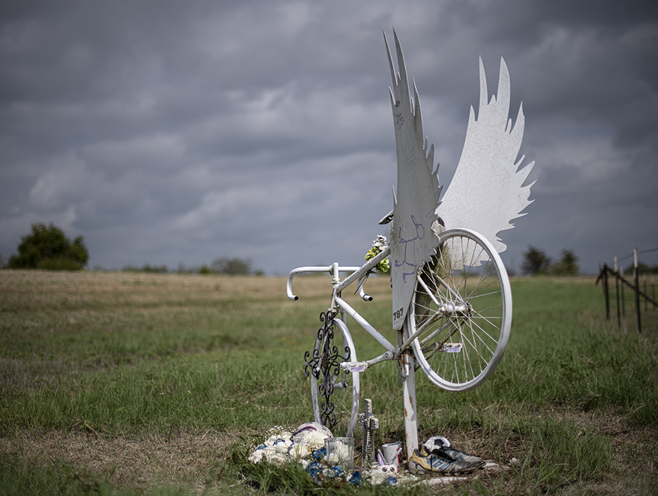 I am seeing too many ghost bikes in recent years. “Ghost bikes” are placed at sites where a cyclist has died after being struck by a vehicle. Today, I made photos of a ghost bike dedication for Donnie Prado, a 59-year-old cyclist who died when struck by a hit-and-run driver on August 30th. The two opening photos are from that somber event. Once the assignment was completed, I wondered about two other ghost bikes I’d photographed. Were they still there? Two photos were made today at a ghost bike placed in memory of 19-year-old Tommy Ketterhagen, who died after being struck at this site in January 2017. The earliest ghost bike documented was in Spring 2014, one dedicated to Georgetown resident Joe Holan, who used his bike to commute to work. Eight days before Christmas 2013, Joe was killed on an interstate access road en route to work. I tried to find the site again today, but didn’t. The photo posted here is of Joe’s widow, Melissa, who saw to it her husband was honored with a bike. I knew Joe. A few months before his death, the newspaper did a story about his bike commutes. He’d email me photos he’d taken on his daily routes. He left behind his wife and two children. We need more bike lanes for cyclists, friends. Sure, the cyclists need to practice caution, but drivers need to do the same.