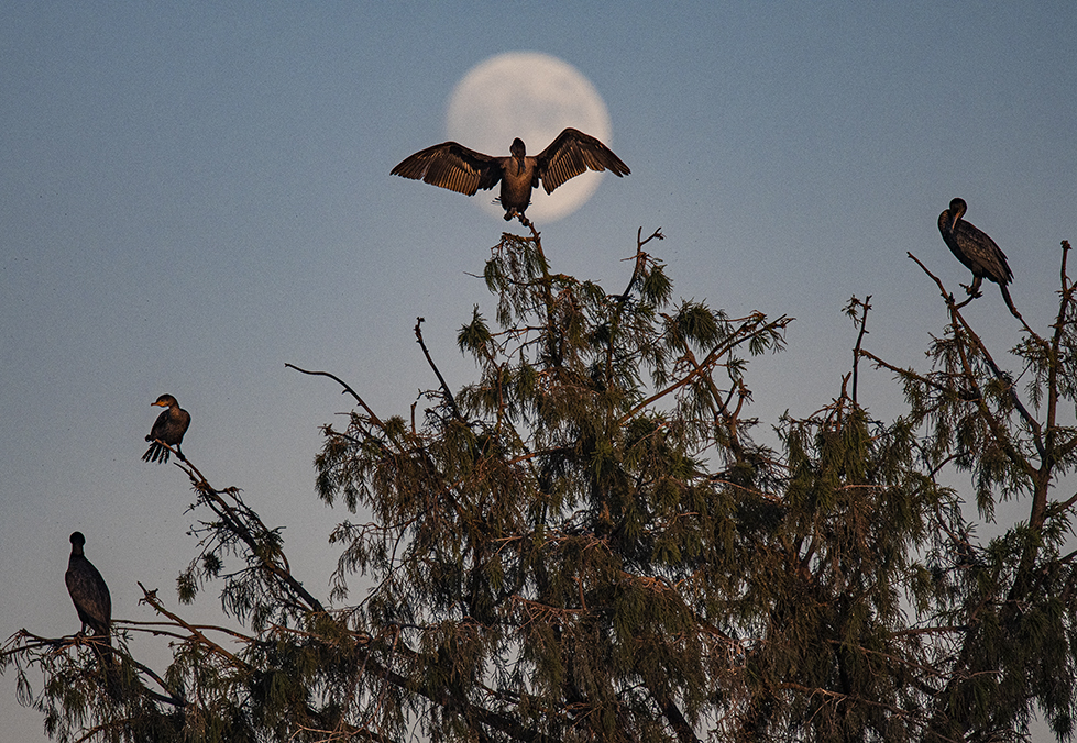 The very busy season at Taylor’s rookery is winding down. The mass of avian life that arrived in the Spring has mostly moved on. This occurs every year in late-September. But life at Murphy Park continues. Throughout the year, you’ll find cattle egrets, cormorants, Great Blue Herons, geese, and (of course) ducks. These images were taken this week as the moon became more prominent in the Central Texas sky. A few Great Egrets were there to say goodbye until next Spring. The park will continue to hold my attention through autumn and winter.