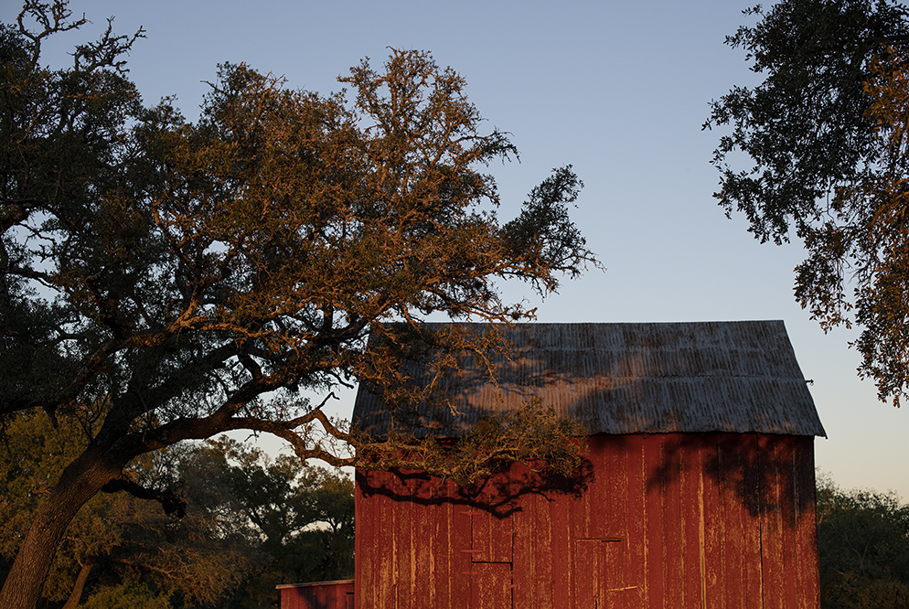 If the timing is right, there’s this elegant little red barn near Walburg I like to photograph. It’s always no more than half a dozen shutter clicks, this time just four. Nestled under a stand of trees, you might pass by without knowing it’s there. The way sunshine graces its facade as the day’s light fades is sweet. A hidden gem.
