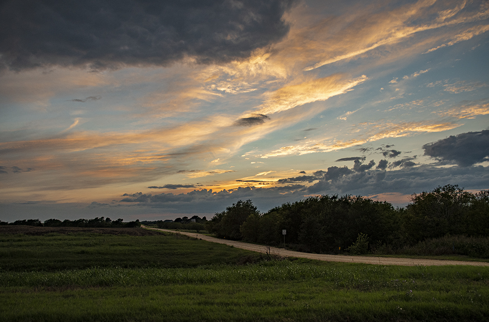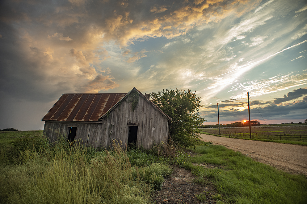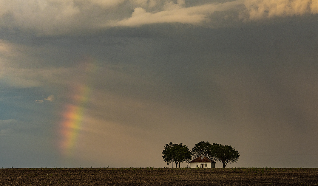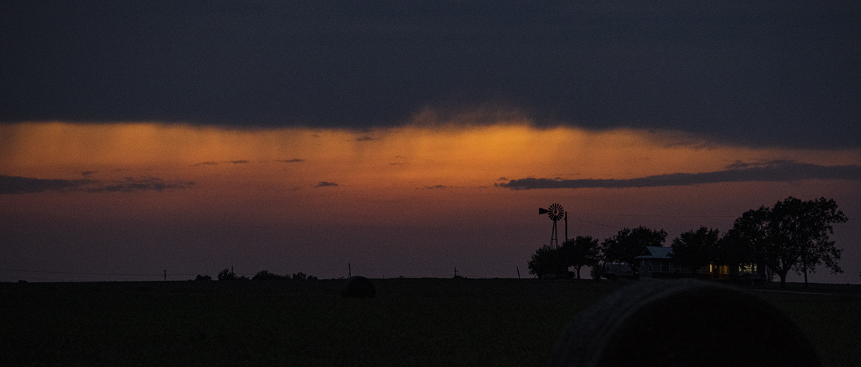 Two photos close to home tonight, a little east of town. The opening shot is one of my favorite old farmhouses. I never see any sign of activity there, but occasionally an RV is parked nearby. Thankfully, when a rainbow briefly appeared, the RV was gone. The other photo is from last night, a long barn that’s always intrigued me. Like that house, I never see activity here, but no matter. It’s eye-catching. Both the house and barn are visible now since the fields in front of them have been harvested.