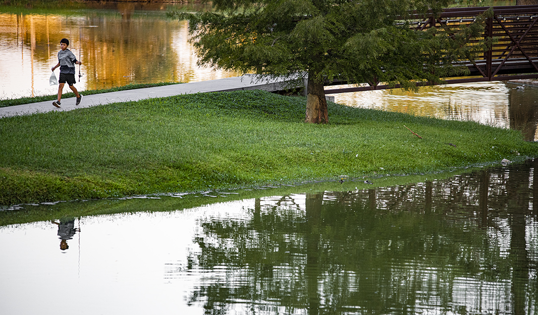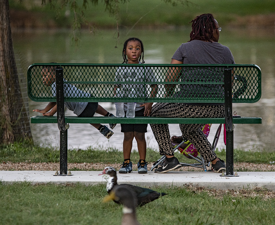 Taylor’s Murphy Park is a place I pass through on my daily walks. While some posts focus on the park’s rookery, it’s a lovely park all year long. Presented here are some photos made there Friday evening, staying close to home. This week I purchased some new camera equipment. This was a good place to use those toys. The activity at the rookery is slowing down. The new egrets are growing, moving on, but it’s still an active area. On this outing I observed a Great Egret, a Great Blue Heron, and yes, a duck or two. And humans. A little guy on a fishing outing with dad, a mom enjoying one of the park’s newest benches. Some of these are pictorial images, some are community journalism. I live in a varied world of photography.