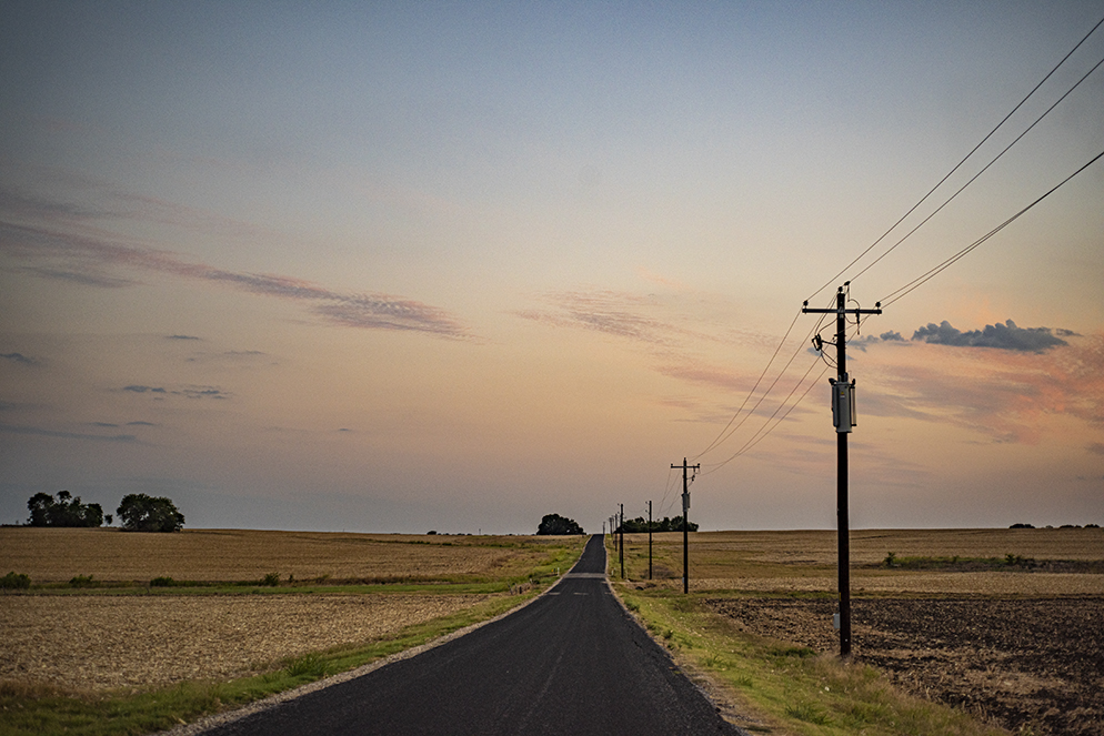 Thankfully, we still have some open spaces around the Blackland Prairie, country roads rolling into infinity, surrounded by recently-harvested fields, now empty. This simple scene is a county road a little south of Bartlett, Texas. I don’t get tired of seeing this.