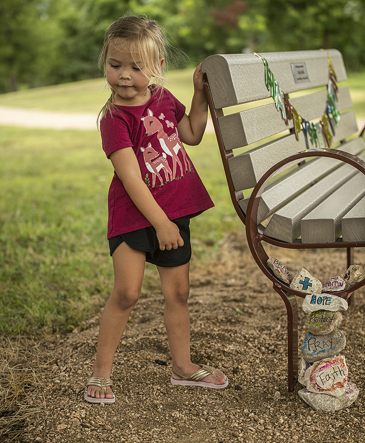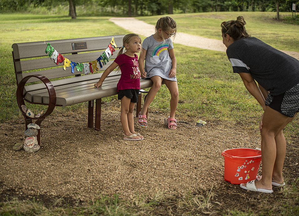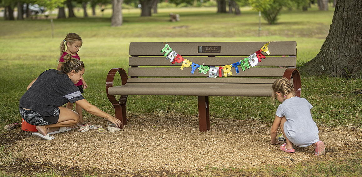 While at Berry Springs Park & Preserve in Georgetown on Sunday afternoon, in the distance I noticed a park bench with brightly-colored letters, “Happy Birthday.” Snapping a photo, I mentally filed it away. Preparing to leave the park, however, I noticed a young woman, accompanied by two kids, adding things to the scene. I asked if it was okay to take a few photos. It turns out the birthday wishes were for her cousin, Cody, who died earlier this year in a motorcycle accident. Sunday would’ve been his 26th birthday. Lindsey, accompanied by her daughters, 7 and 3, placed painted rocks with inspirational words around the bench to further mark the day. Co-workers with Cody’s mom were able to add a permanent plaque to remember him. The park’s pond was Cody’s favorite place to fish. This was a bit subtle, somewhat quiet, but I thought it worth sharing here.
