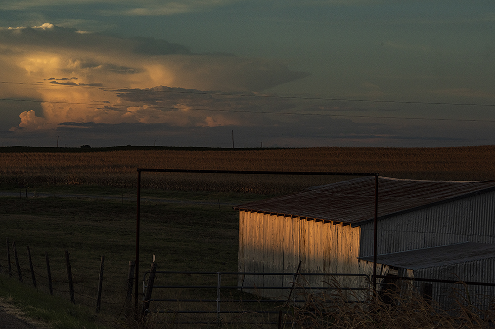 I hadn’t planned it like this, but the post made earlier tonight? An expansive field of crops seen a few minutes after sunrise this morning? Well, this photo was made along that same county road two nights ago as the day’s final burst of sunlight fell onto an old outbuilding. Mentioned before many times, but I do love this Blackland Prairie.