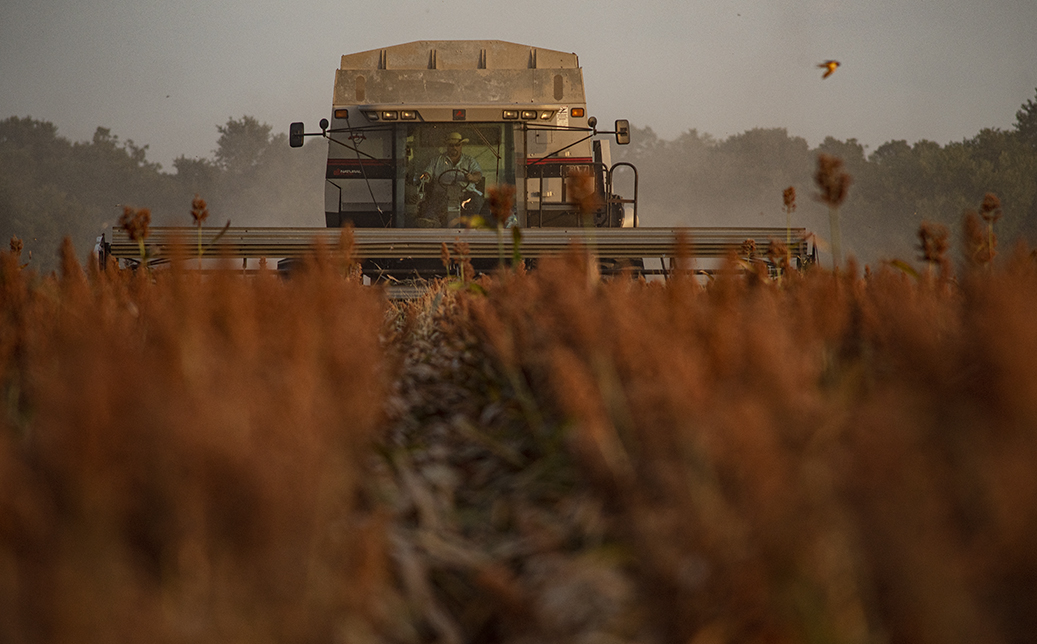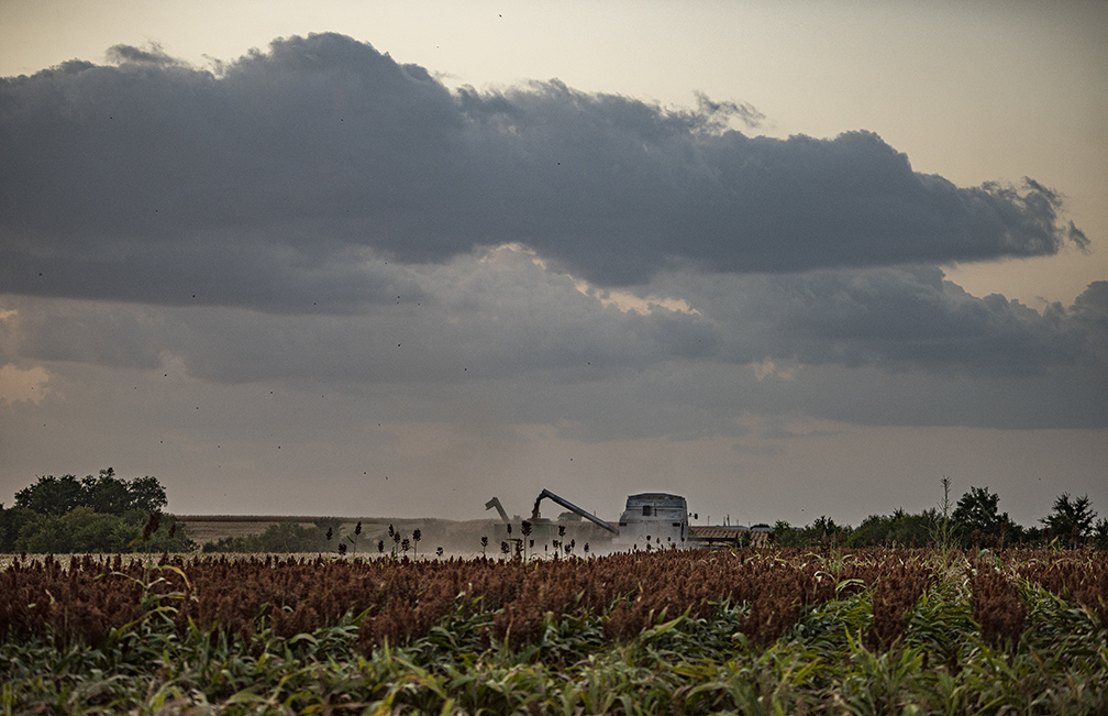 My Taylor friend Michelle Miller lives in town, but she and her husband, Joe Moldenhour, and Brian Miksch, Michelle’s brother-in-law, also farm on the Backland Prairie. They are a small operation if compared with some of the huge family farms in our area, but they know this land very well. These photos were taken on a recent night as they harvested milo (also called maize) in a field east of Thrall. Joe’s the fellow in the Longhorn Baseball t-shirt. Hook ’em. Respect our farmers, friends.