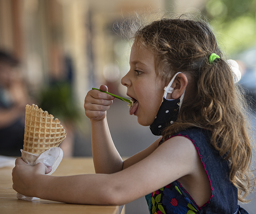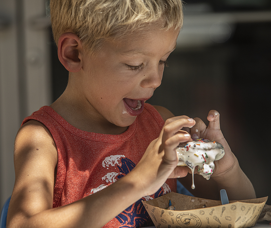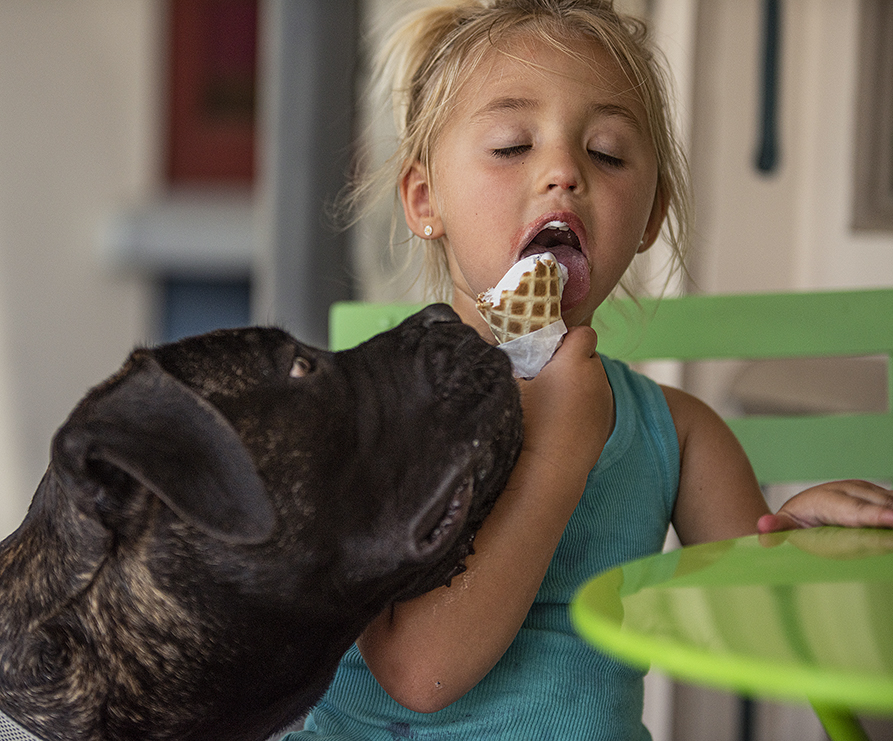 Remember, folks, this is Texas. Our summers begin in April around here. As we approach mid-July, temperatures reach the low-100s almost every day. Much of this Saturday was spent around the square in Georgetown, where families could find some really good ice cream, making things a little more tolerable. I made these photos at two popular destinations, All Things Kids and The Baked Bear. Both do ice cream quite well! In the opening photo, a young lady, 3, enjoys her treat while Molti, the family’s 6-month-old Bull Mastiff, waits for something to fall his way. Dad says when he’s grown, Molti will weigh about 160 pounds. He’s a sweet boy, as his 3-year-old well knows. The other photos are just icing on a very hot cake.