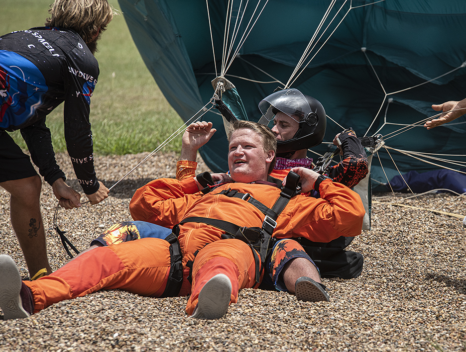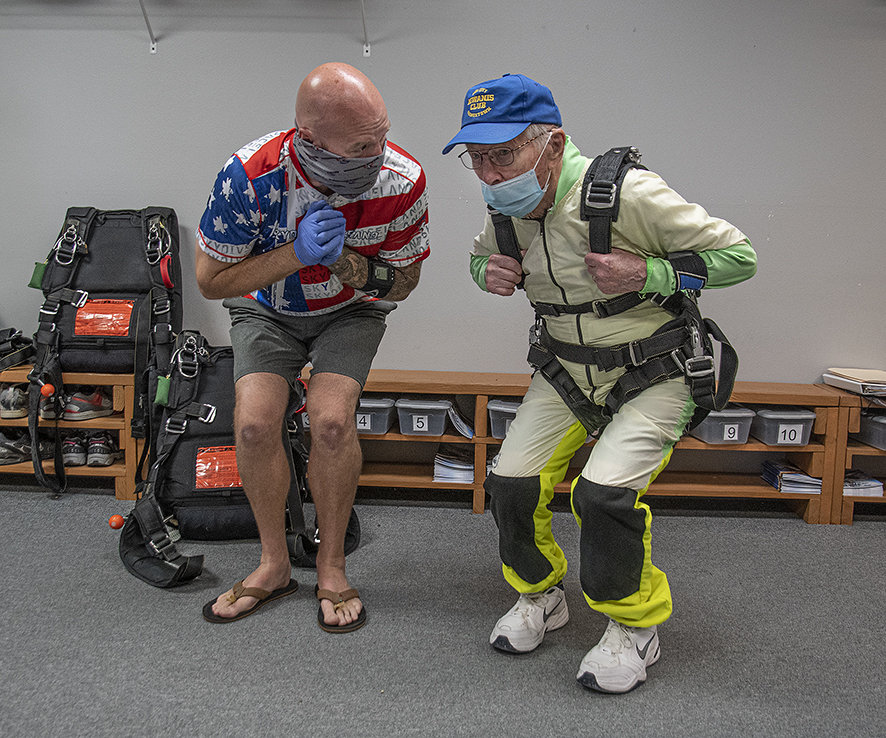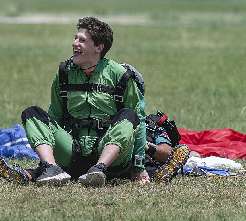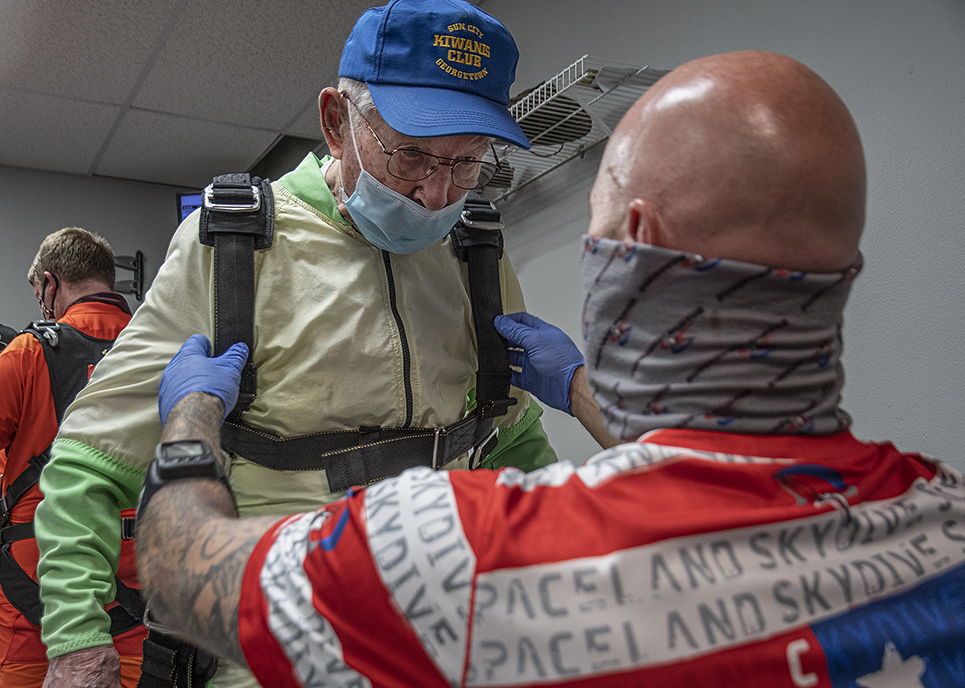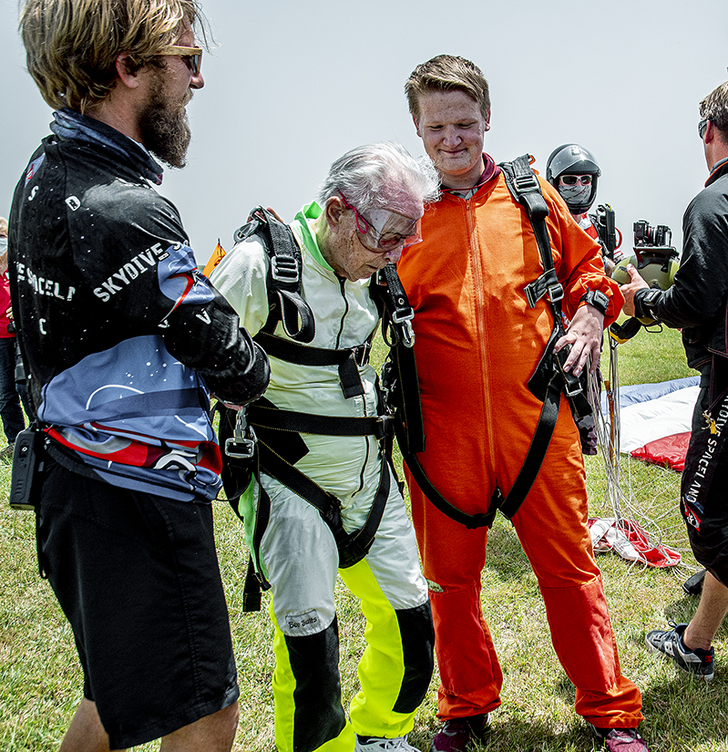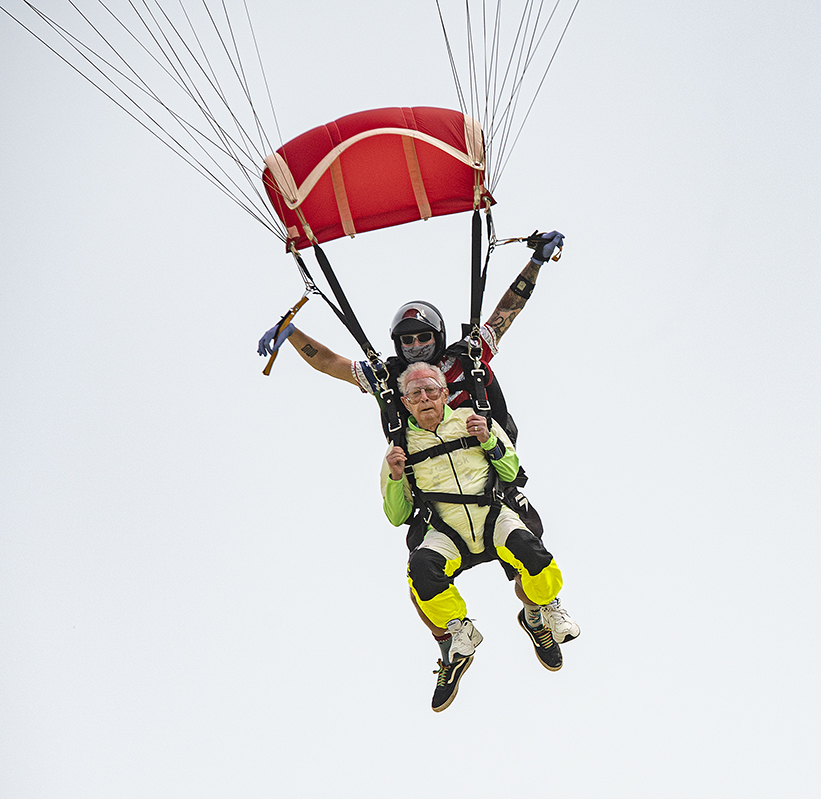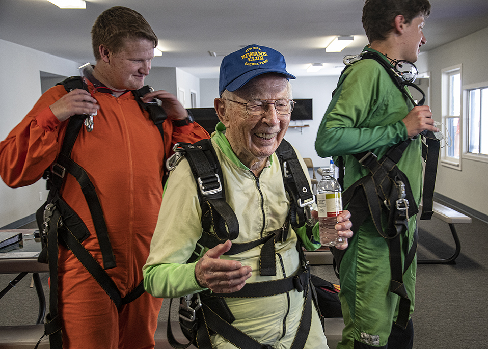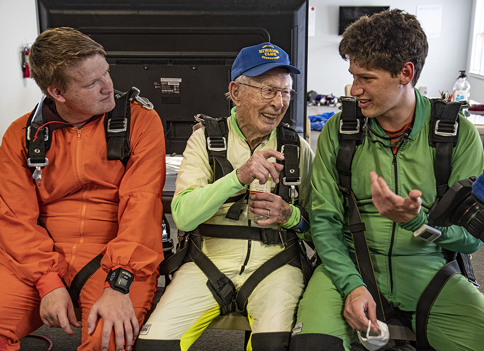 A few years ago, I photographed Georgetown’s Al Blaschke as he went skydiving on his 100th birthday. Now 103 (and a half!), he repeated the feat, this time, joined in the Texas sky by his 22-year-old twin grandsons, Jason and Kevin. Today’s tandem jump celebrated the brothers’ graduation from college, Jason from Texas A&M, Kevin from my alma mater UT-Austin. But there was another goal to achieve this time, becoming the world’s oldest tandem skydiver. The record has been held by a 101-year-old from the United Kingdom. The Guinness folks are awaiting today’s results, but it looks like Al’s on top once verification is made. These photos were taken at Skydive Spaceland San Marcos, located in Fentress, Texas. The last photo shows Al’s friend, Ernie Columbus, as he snaps a keepsake photo of his buddy. Ernie recently took up skydiving on his 100th birthday earlier this year. Best wishes to both Al and Ernie! And to the new college graduates.