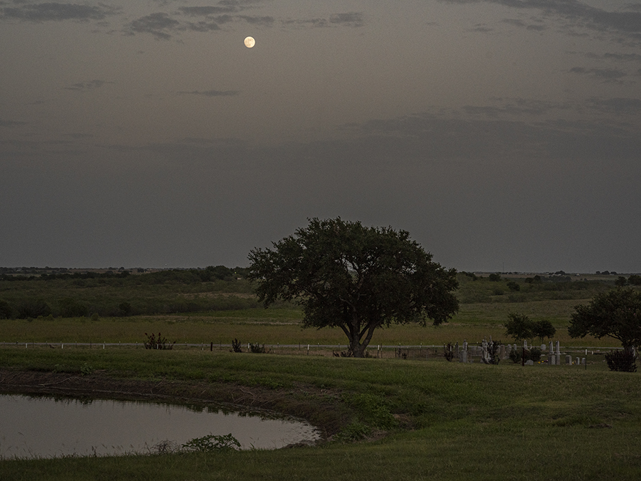 The Saharan dust flying through Texas is great for sunsets, but after waiting for the haze to clear tonight for an almost-full moon, I’m irritable. The moon finally made an appearance, about 75 minutes late. At any rate, you have a sunset, plus two moon photos, one at Prince of Peace Lutheran Church cemetery, another by a cornfield. I’ll sign off now.