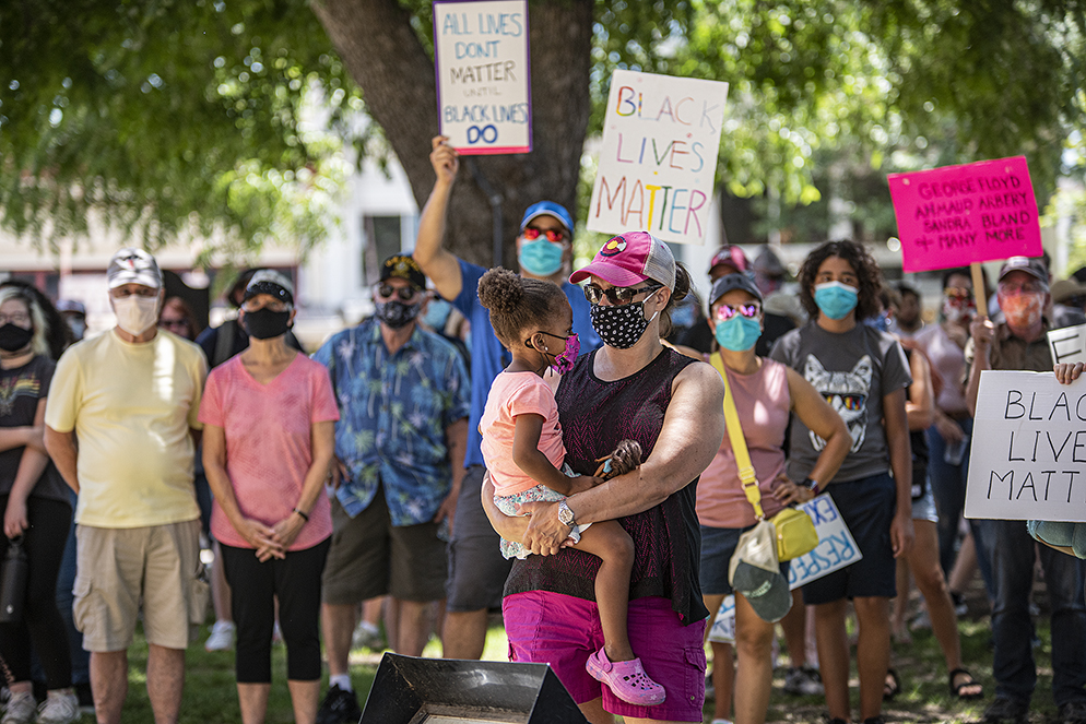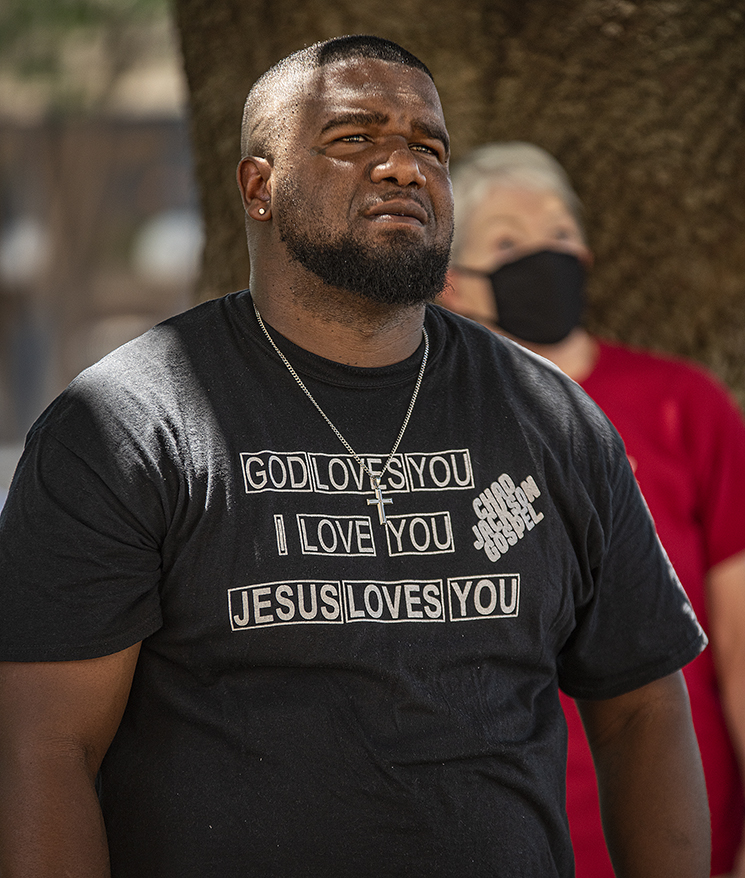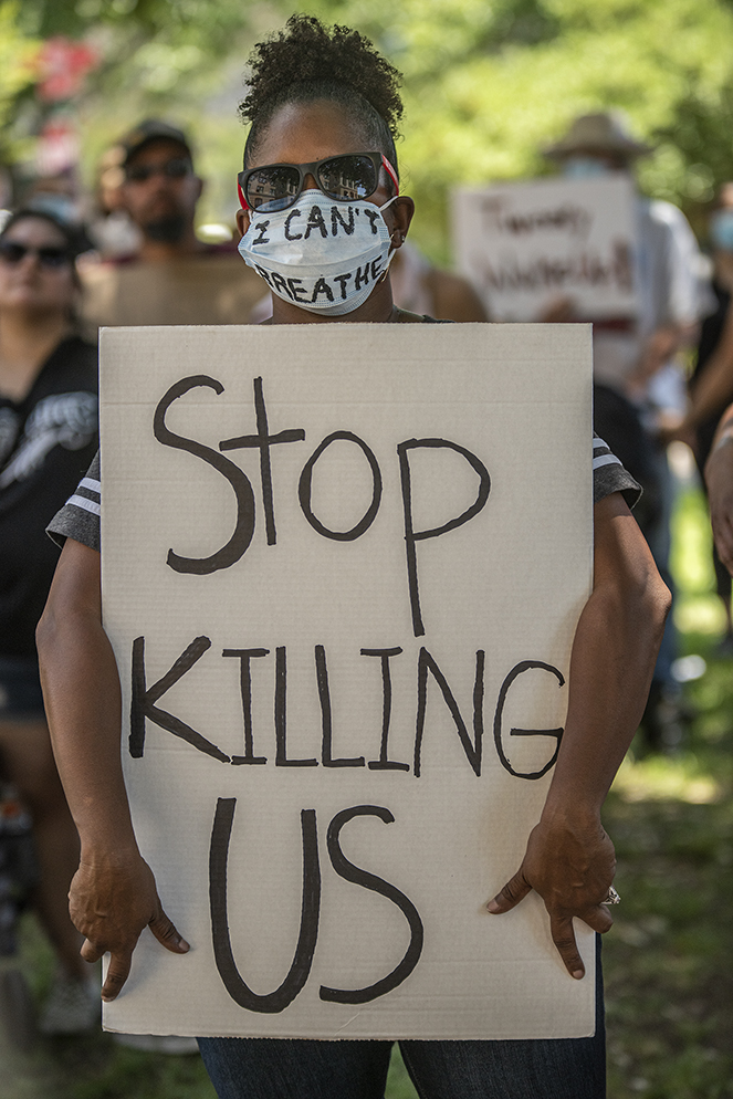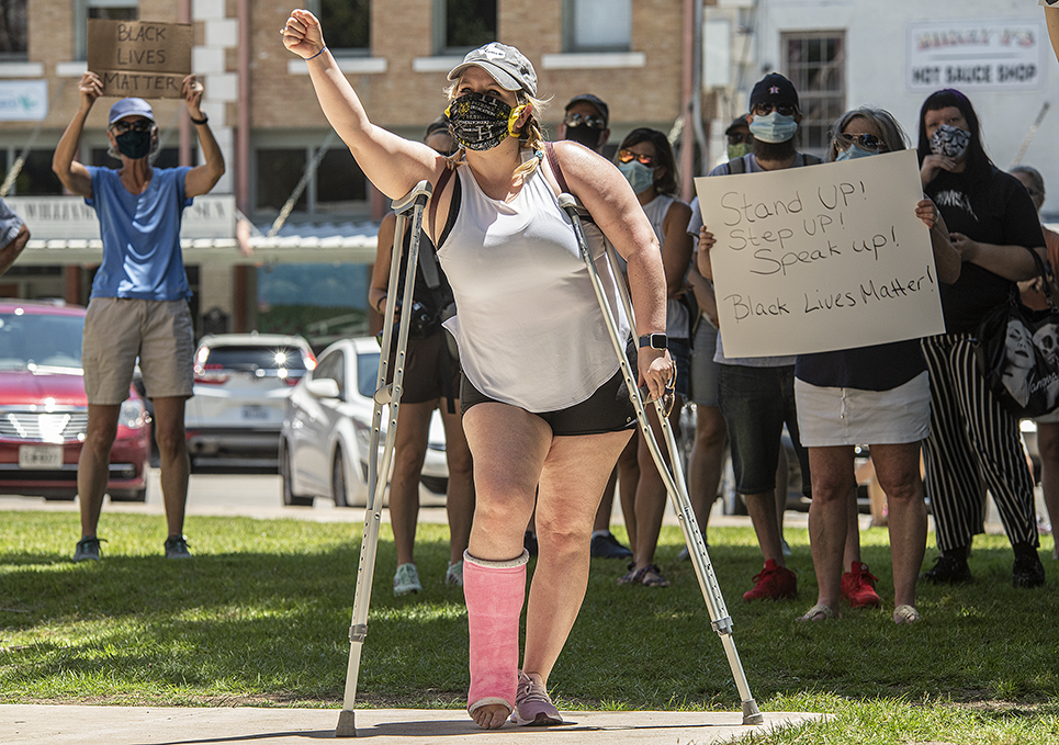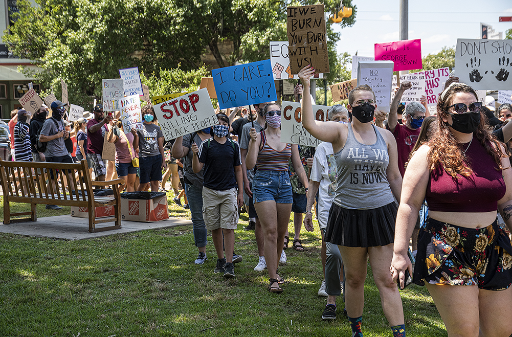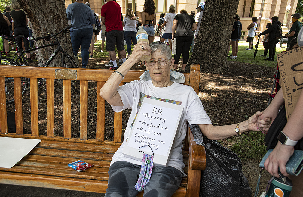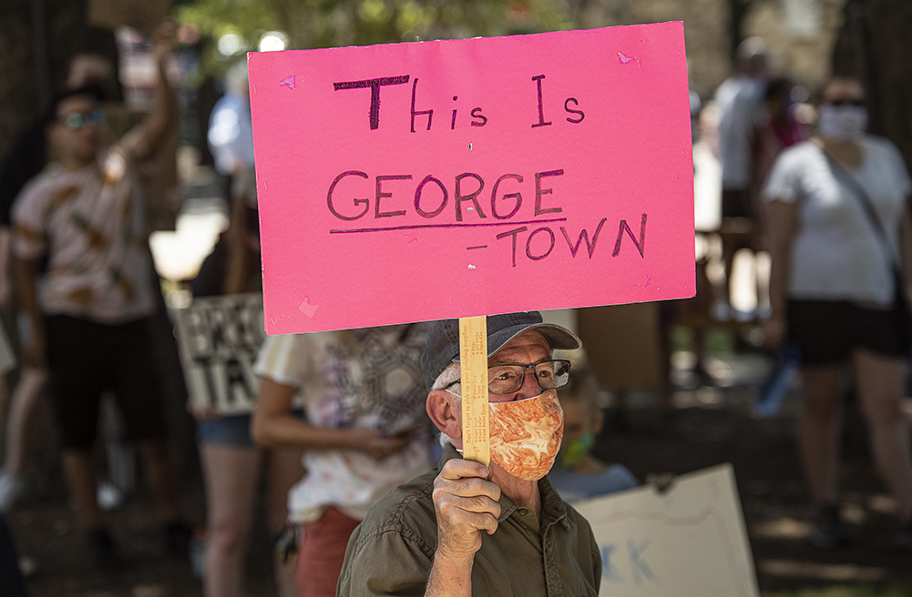This afternoon I photographed a gathering of 350-400 participants at a Georgetown demonstration calling attention to the need for reform in how African Americans are treated in the United States. It was a hot and humid day, temperatures climbing to the upper 90s. While the problem of fair and just treatment has existed for a very long time, the impetus for worldwide protests was brought to the forefront by the death of George Floyd in Minneapolis. Floyd was raised in Houston. The three-hour demonstration was peaceful, unlike many we’ve seen around the country. And more people than not were wearing face masks. On social media, I’ve expressed concern about large numbers gathering in the midst of a pandemic. I still have those concerns, but feel good about the last image, a granddaughter holding the hand of her overheated grandmama. This gives me hope that we can get things right.