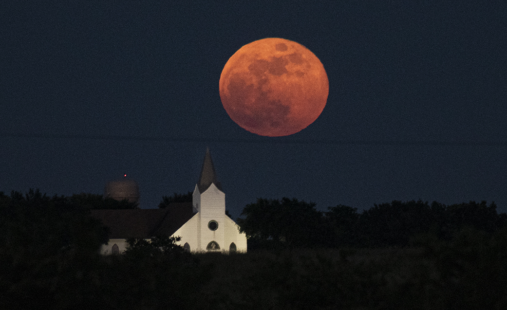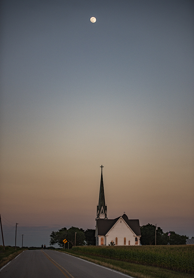 This photo is by no means perfect. There’s a blaring red light on a water tower in the distance. There’s power lines. too. As many know, I don’t remove actual things with Photoshop. That’s Immanuel Lutheran Church tonight, a full moon, a Strawberry Moon, shining above.