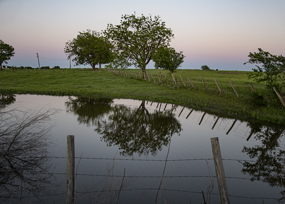 Just a simple scene from the far reaches of East Williamson County, Texas tonight, friends. I’ve passed this pond quite a few times over the years, but this time it was worth a second look. If you’re looking at this on a larger screen, you may notice the church in the far distance at upper left, Zion Lutheran Church, in the Sandoval community, very close to the Milam County line.