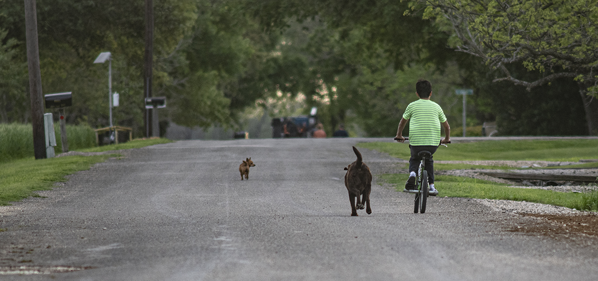 Two pretty simple photos tonight, friends, both near Granger, Texas. The opening photo is a grab shot, a boy practicing social distancing as he rides his bike on a cool spring night, joined by two canine buddies. The second is a few miles east of Granger, near sunset. I’ll leave it at that. Be safe.