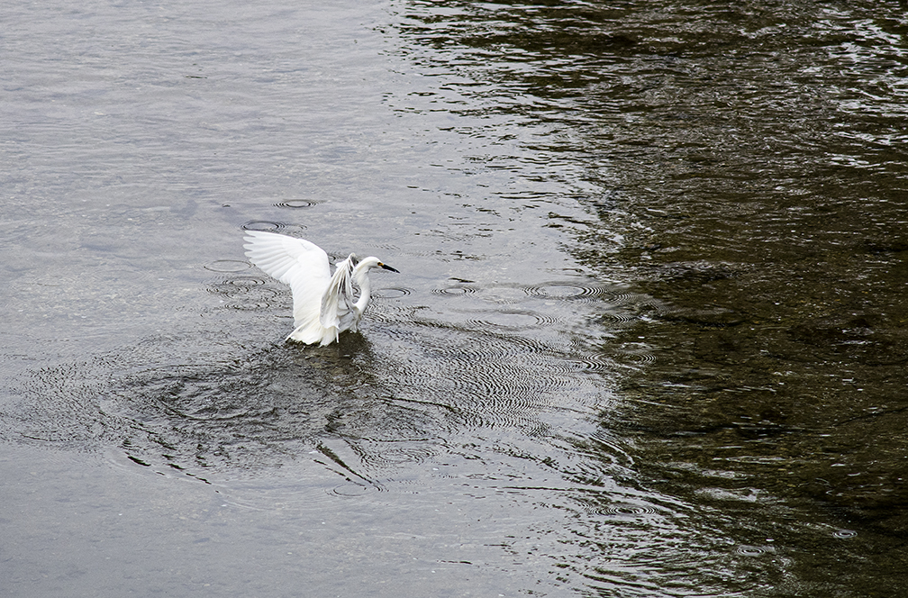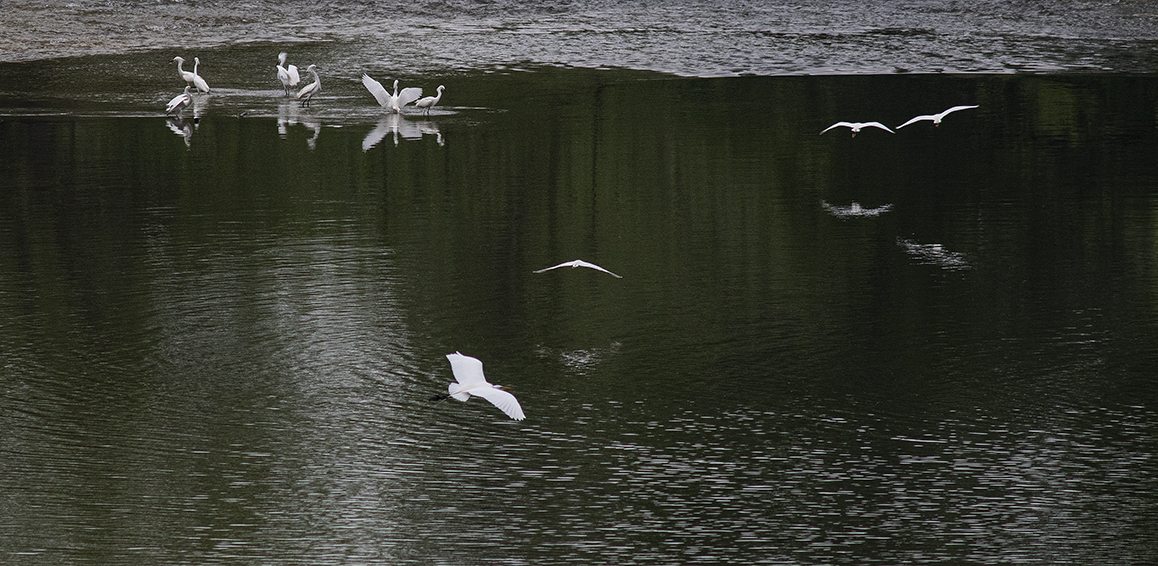 Although I’m still waiting for the arrival of more egrets at Taylor’s Murphy Park, when in Georgetown yesterday, I happened on some as they foraged for fish above the San Gabriel River as it coursed through San Gabriel Park. I will leave it at that, friends.