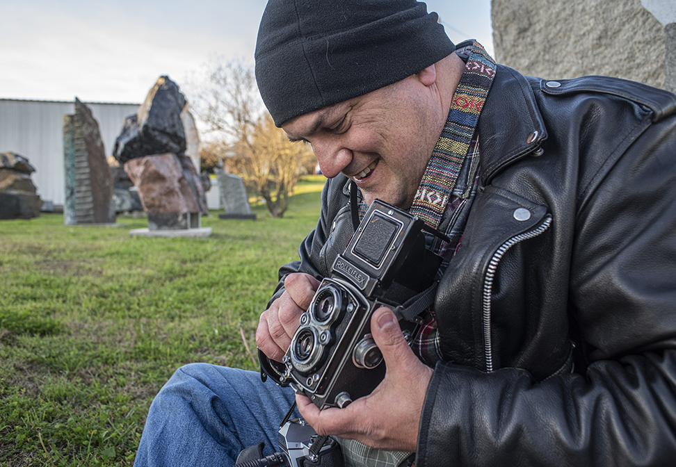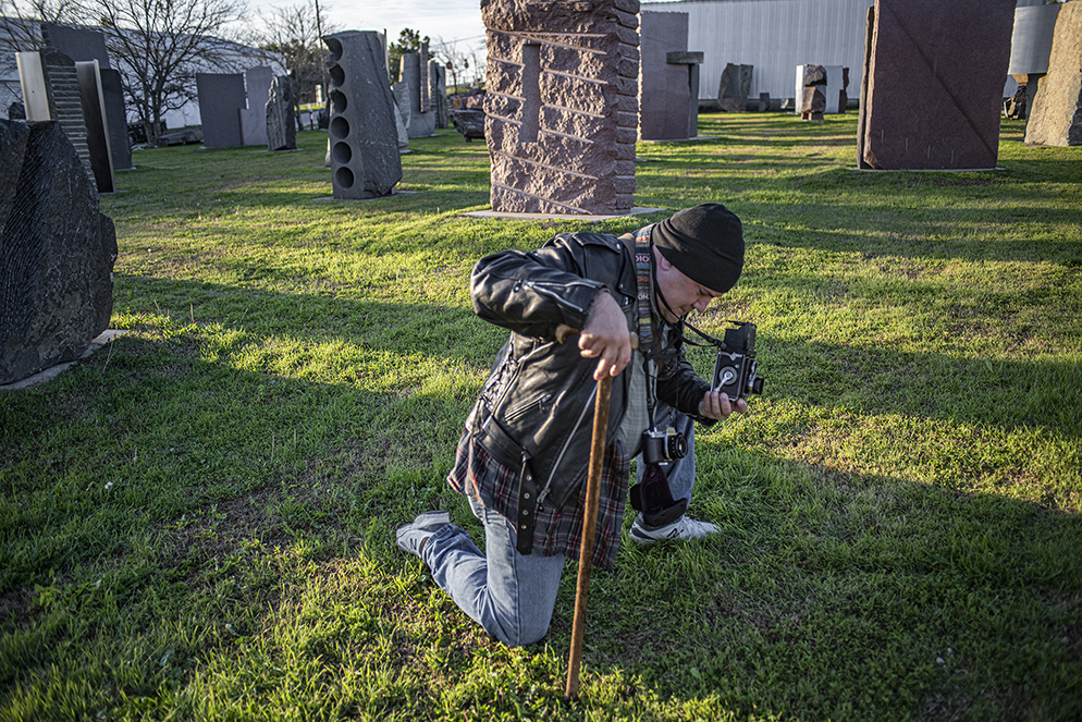 In 2020, Todd is an accomplished photographer. Until the Coronavirus put a temporary stop to the Georgetown Photography Festival, originally planned for March 21st, he was a featured presenter. The festival has been rescheduled for August 22nd. Although he owns a digital camera, Todd’s preferred medium is film. Black-and-white film. After shooting photos, he makes excursions to The Darkroom Co-op, near the UT-Austin campus, where he develops his film and follows up with old-fashioned prints made on an actual enlarger. Remember those, friends? They’re still with us. His photo expeditions are varied. Recently, I met him in Coupland, where he arrived before dawn to photograph the Huntington Sculpture Garden, the creation of sculptor Jim Huntington. He moved carefully through the work, using his walking stick to navigate the area with his Pentax K1000 (35mm) and a vintage Rolleiflex (120mm). Film, of course.