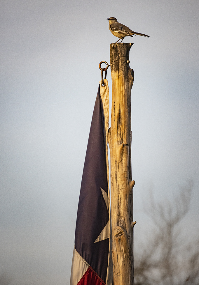 When leaving Georgetown’s Berry Springs Park & Preserve on a recent evening, I stopped to admire the agave and other flowering plants lovingly cared for by Williamson County Master Gardeners and Master Naturalists. Agave is an interesting plant, anyway, but add a Northern Mockingbird (our state bird) and a Bluebonnet (our state flower) and it’s even better. That mockingbird and I had a stare-down with each other for almost 30 minutes. While it made sense she (he?) would leave, she stayed around to mock me! It seemed only right that she perched over the state flag for a while. This is mostly about the bird and agave, but there’s one state flower included, too. More of that to come in a later post.