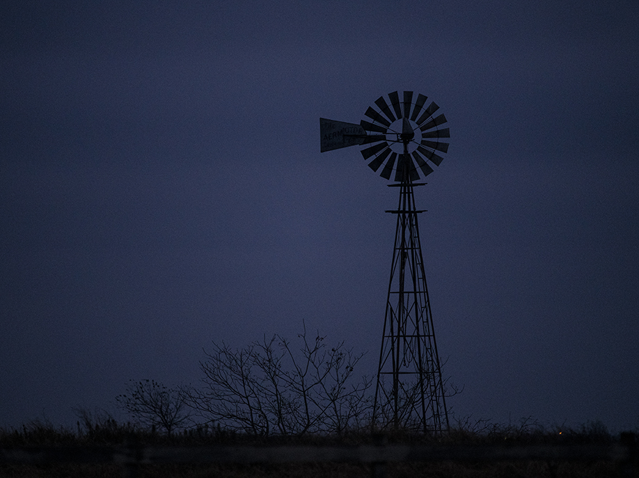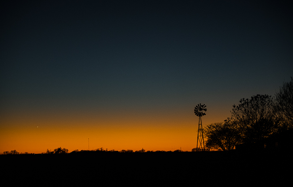 Even when not posting them, it’s a pretty good bet that I’m taking photos of windmills, our rural Texas skyscrapers. Beginning with one taken this evening, presented here are four taken since the start of winter. The one surrounded by blue light was taken before dawn on Christmas morning. Expect more of these at some point.