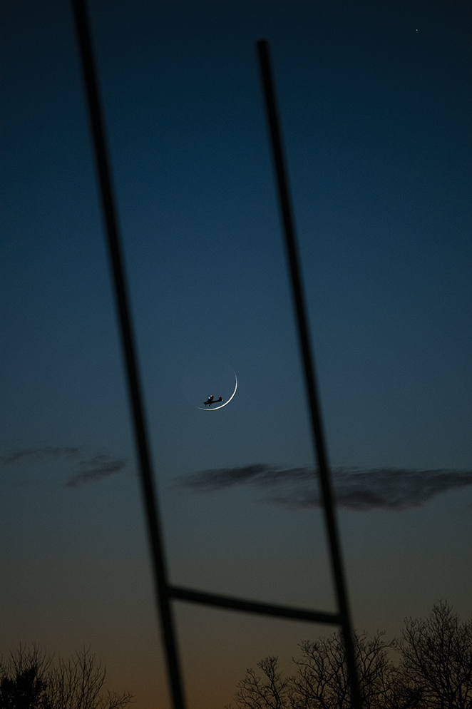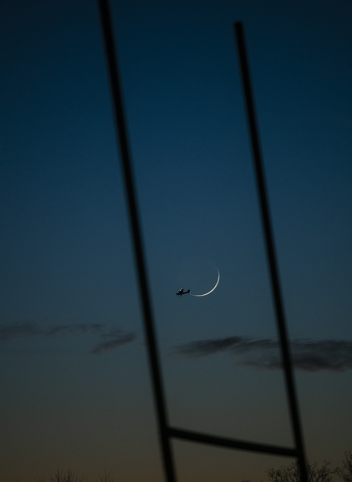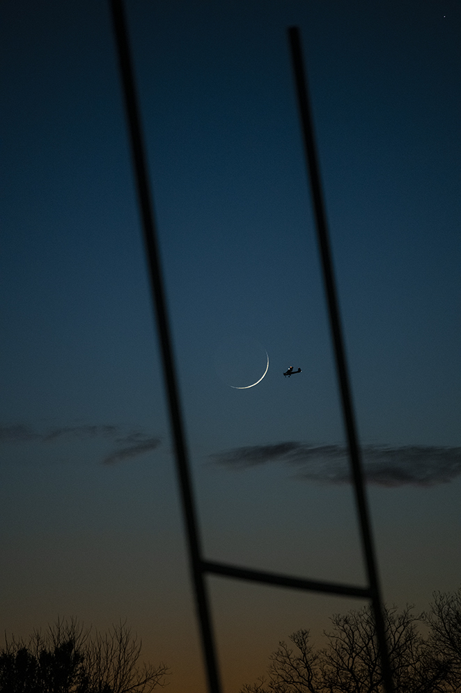 It’s always nice to include both a sunset and moonrise in a post. That’s what you see tonight. A vibrant setting sun east of Granger was followed by the appearance of a Waxing Crescent moon, just 2.6% visibility, shining through goalposts at Taylor Middle School. The airplane flying through the scene was an interesting addition.
