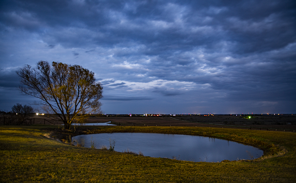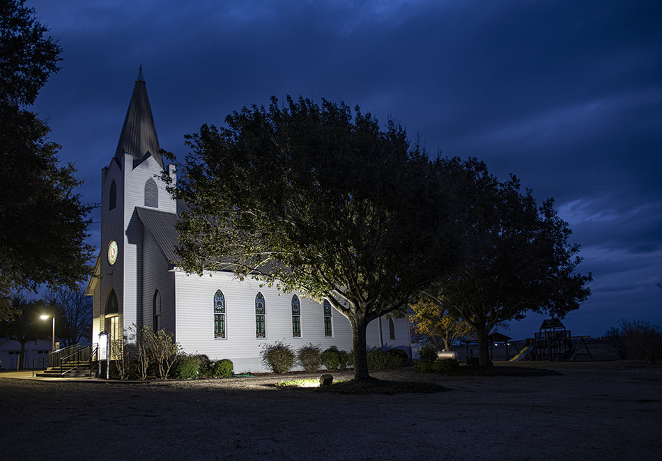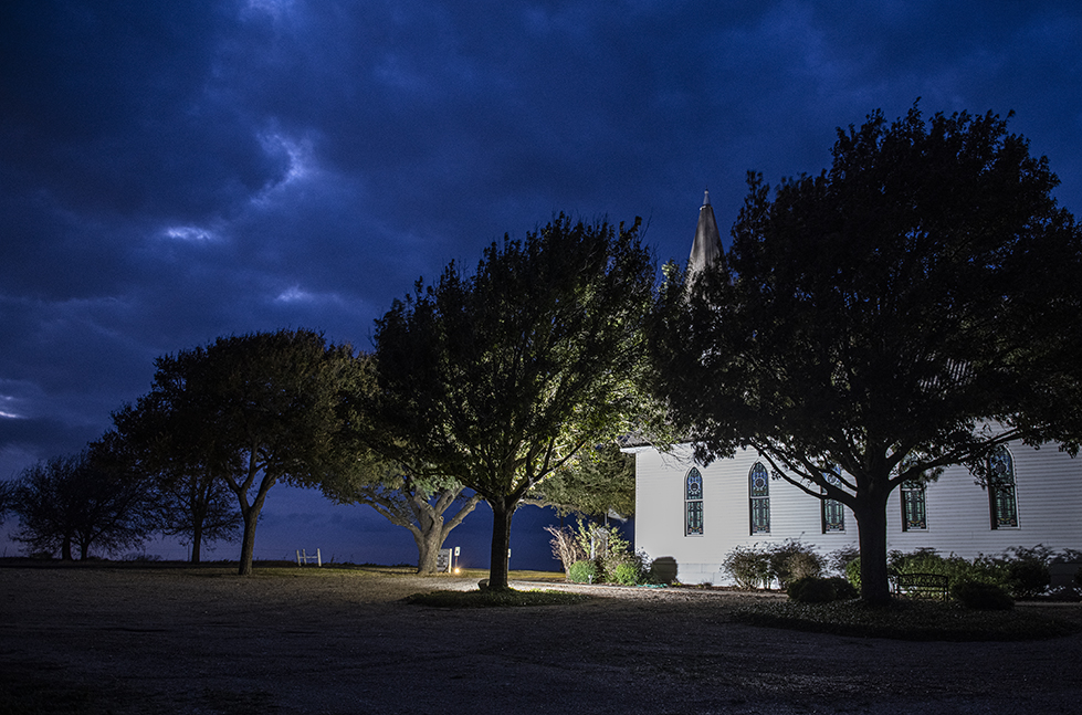 Just some photos taken tonight at Prince of Peace Lutheran Church in Wuthrich Hill, Texas. I’ve photographed this church a few times a year, beginning in 2009, the year we returned to Texas. At the time, I didn’t know that one of my UT-Austin photo professors, Frank Armstrong, had also photographed it quite a few years before. It was a good night for blue light. Sometimes I take time to photograph the church’s pond. It’s not a stock pond. No livestock wanders on the church property. It’s just a nice little body of water.