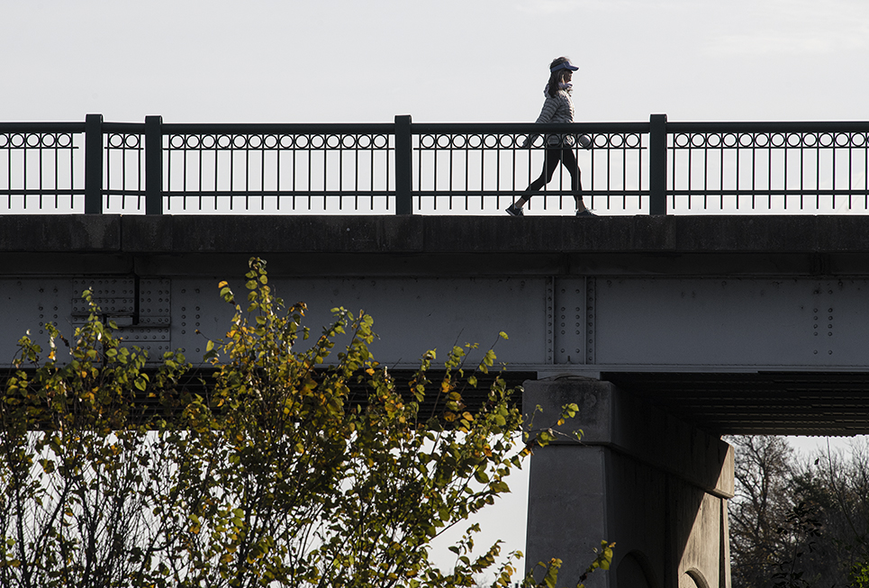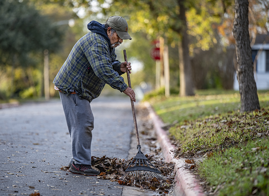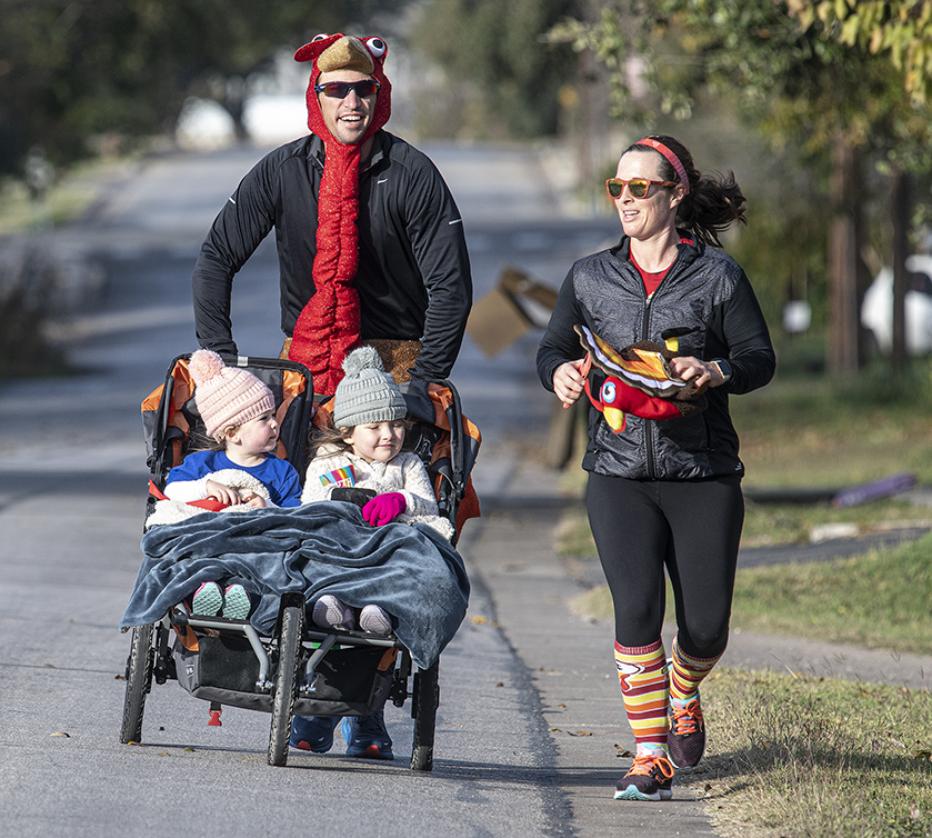 While I didn’t have a specific Thanksgiving assignment this morning, it was still a good day to wander around. Note that these images are presented in order of information given. Hoping for a sunrise photo at the historic Jonah School (now a community center), I encountered a very cloudy morning instead. The elegant tree still looks good, particularly now that it’s losing some of those warm weather leaves. I like seeing its bones. After leaving Jonah, I stopped by the San Gabriel River about fifteen minutes after sunrise. The clouds were hanging on. A few minutes later, the sun tried to peek out as I drove through the I.O.O.F. City Cemetery in Georgetown. Passing through Georgetown’s Old Town historic district, I met Mario, earning a bit of holiday money raking an abundance of leaves about 45 minutes after sunrise. There’s no Turkey Trot road race in Georgetown this year, but I did notice members of The Georgetown Triathletes group as they passed over the river along the Austin Avenue bridge. Finally, I met a turkey-clad couple, enjoying a morning run together with their daughters. They’d run in past Turkey Trots, but this morning they ran from home. You can’t hold back a determined turkey!