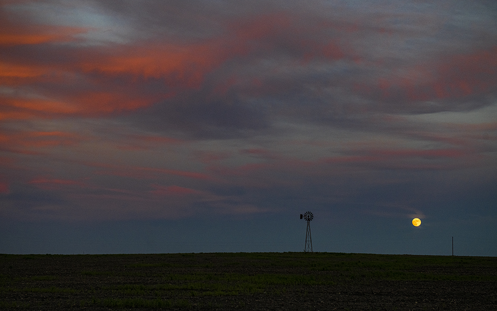 It’s a windmill I’ve photographed dozens of times, but always from one point of view. I’d wanted to take photos of the rising full moon, but needed to point the camera to the east. To accomplish that, I needed to be on someone’s property, something I prefer not do without permission. About 30 minutes ahead of moonrise, I was able to connect with with the gentleman who lived there, who generously gave permission. Because I like to give a sense of place, the opening photo is my favorite. The middle image gives you that “big moon” idea. The last photo was taken from my usual point of view, but the skies looked magnificent in the west, too. Of all the windmills I’ve photographed, this may be my favorite.
