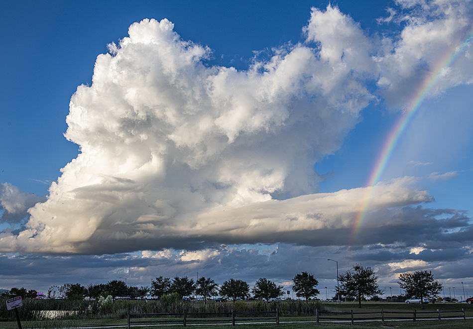 A leftover from the last evening of the Williamson County Fair & Rodeo, at the Expo Center in Taylor. I was sitting in a long line of traffic waiting to get in when a vibrant rainbow appeared. The line to get into the fair was too much for me. I drove on. Crowds are a bother. Rainbows, not so much. Note a hint of the midway at lower left.