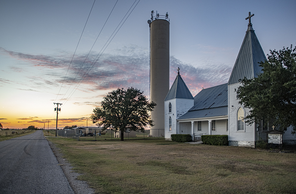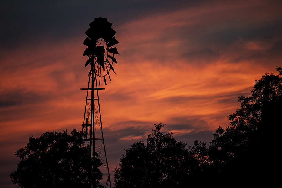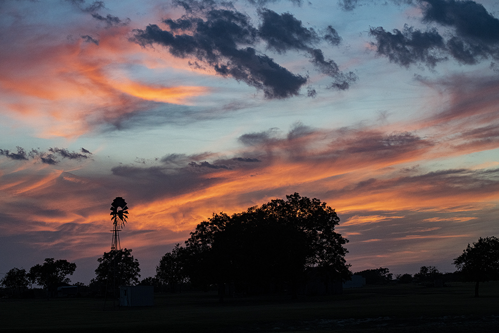 This windmill is from a recent drive through the North Williamson County town of Walburg. Although it’s yet another windmill, the colorful evening sky was reason enough to stop. Both photos are of the same windmill. As an old newspaper guy from the print journalism days, we’d often turn in photos that could be readable if run large, but we’d also do something tighter in the event space was tight. The wide version is my preference.
