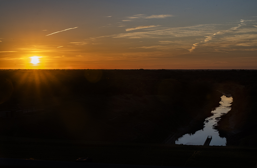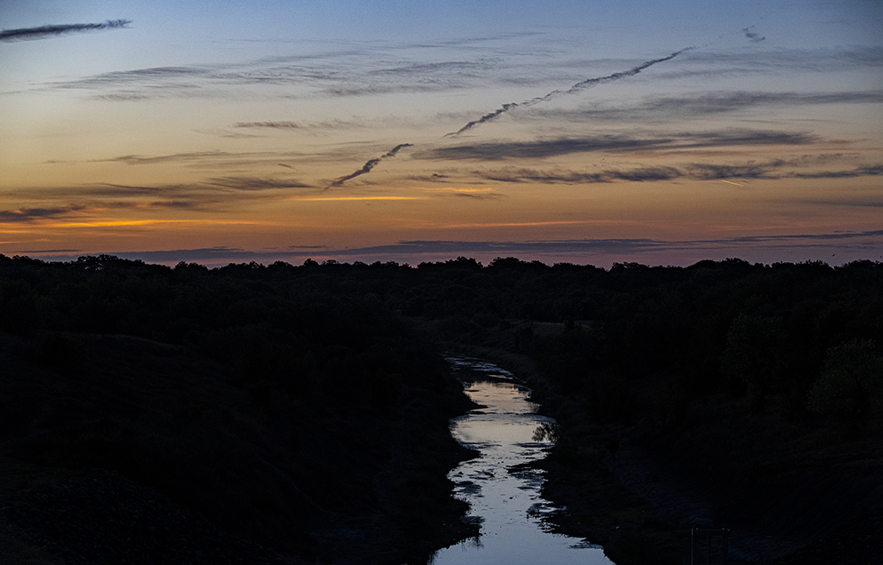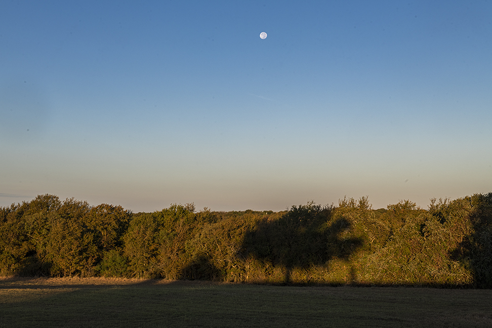 The Autumnal Equinox is here. Even though the calendar tells us it’s fall, that doesn’t mean an end to hot weather in Texas. But luck was with us in Central Texas today. This morning’s temperature hovered around 60, with just 44% humidity. Knowing a cool day awaited us, I managed to get up and going well before dawn this morning, stopping for a few minutes to watch the sun come up over a portion of the San Gabriel River as it begins to flow just east of the Granger Lake dam. Light adorned with orange, yellow and blue hovered over a dark swath of Blackland Prairie, but the river was sparkling as it meandered through the countryside. The first photo was taken 25 minutes before sunrise, the second about 15 minutes before. When the sun finally came up at 7:20, it was a bright hot ball, a little intense for first light, but still nice. Preparing to leave, in the western sky above Granger Lake the Waning Gibbous moon, still close to full at 97.3% visibility, was a nice thing to see above trees saturated with early-morning warmth. The moon photo is about 20 minutes after sunrise. After that, the light’s delicate touch became harsher. I headed home.