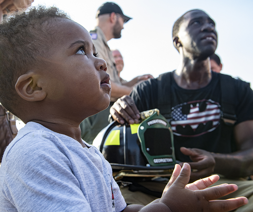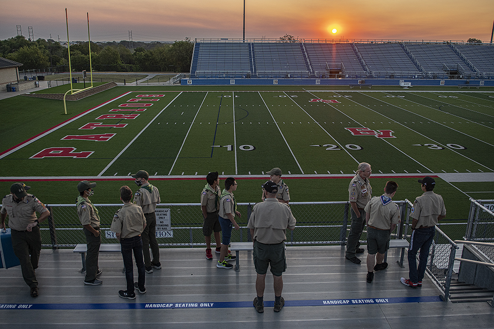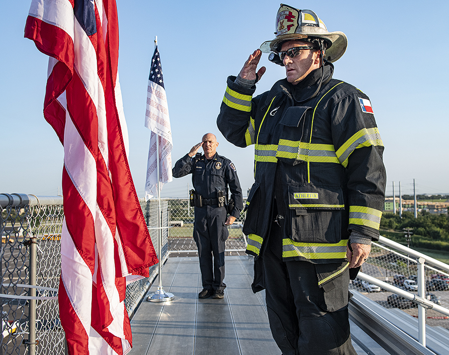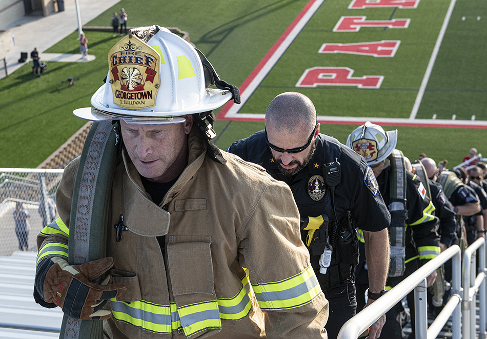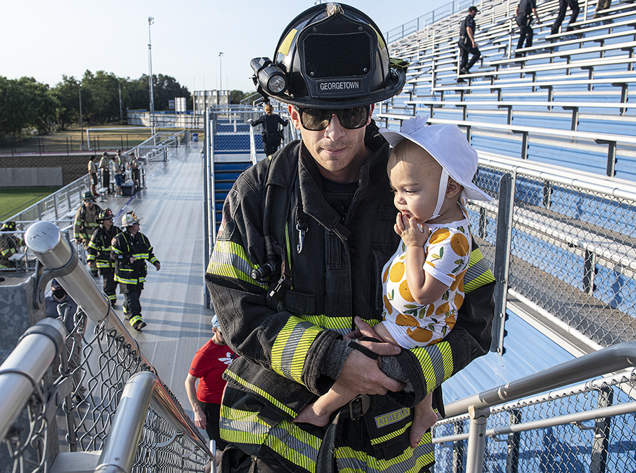 As the 20th anniversary of the 9/11 attacks, once again I was at Birkelbach Field in Georgetown for the city’s Memorial Stair Climb, arriving before sunrise, along with Boy Scouts and Cub Scouts from Troop and Pack 151, there to hand out hydration drinks to participants. The climb seeks to give a sense of what first responders went through at the World Trade Center in 2001. The light-colored flag is adorned with the names of all the first responders who died. One firefighter did the climb carrying his 15-month-old daughter. As the event wound down, a little boy stood near his firefighter daddy as the posted flags were taken down. These commemorations happen throughout the country each year. All have meaning.